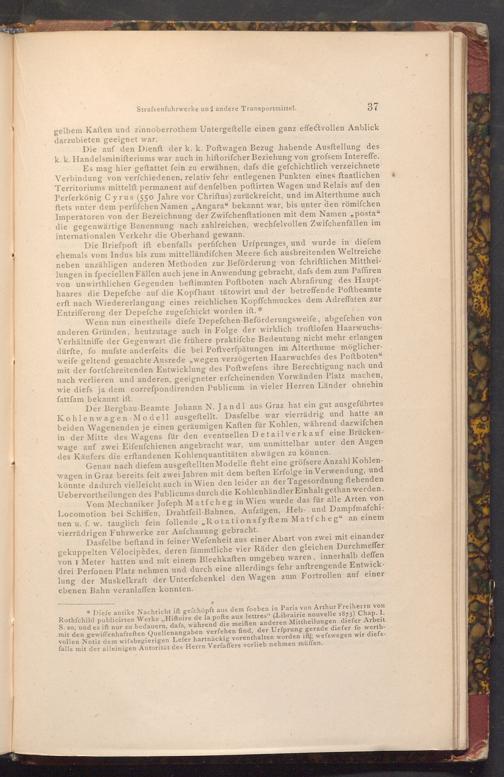 Die auf den Dienft der k. k. Poftwagen Bezug habende Ausftellung des k. k. Handelsminifteriums war auch in hiftorifcher Beziehung von grofsem Intereffe. Es mag hier geftattet fein zu erwähnen, dafs die gefchichtlich verzeichnete Verbindung von verfchiedenen, relativ fehr entlegenen Punkten eines ftaatlichen Territoriums mittelft permanent auf denfelben poftirten Wagen und Relais auf den Perferkönig Cyrus( 550 Jahre vor Chriftus) zurückreicht, und im Alterthume auch ftets unter dem perfifchen Namen„ Angara" bekannt war, bis unter den römifchen Imperatoren von der Bezeichnung der Zwifchenftationen mit dem Namen„ posta" die gegenwärtige Benennung nach zahlreichen, wechfelvollen Zwifchenfällen im internationalen Verkehr die Oberhand gewann.