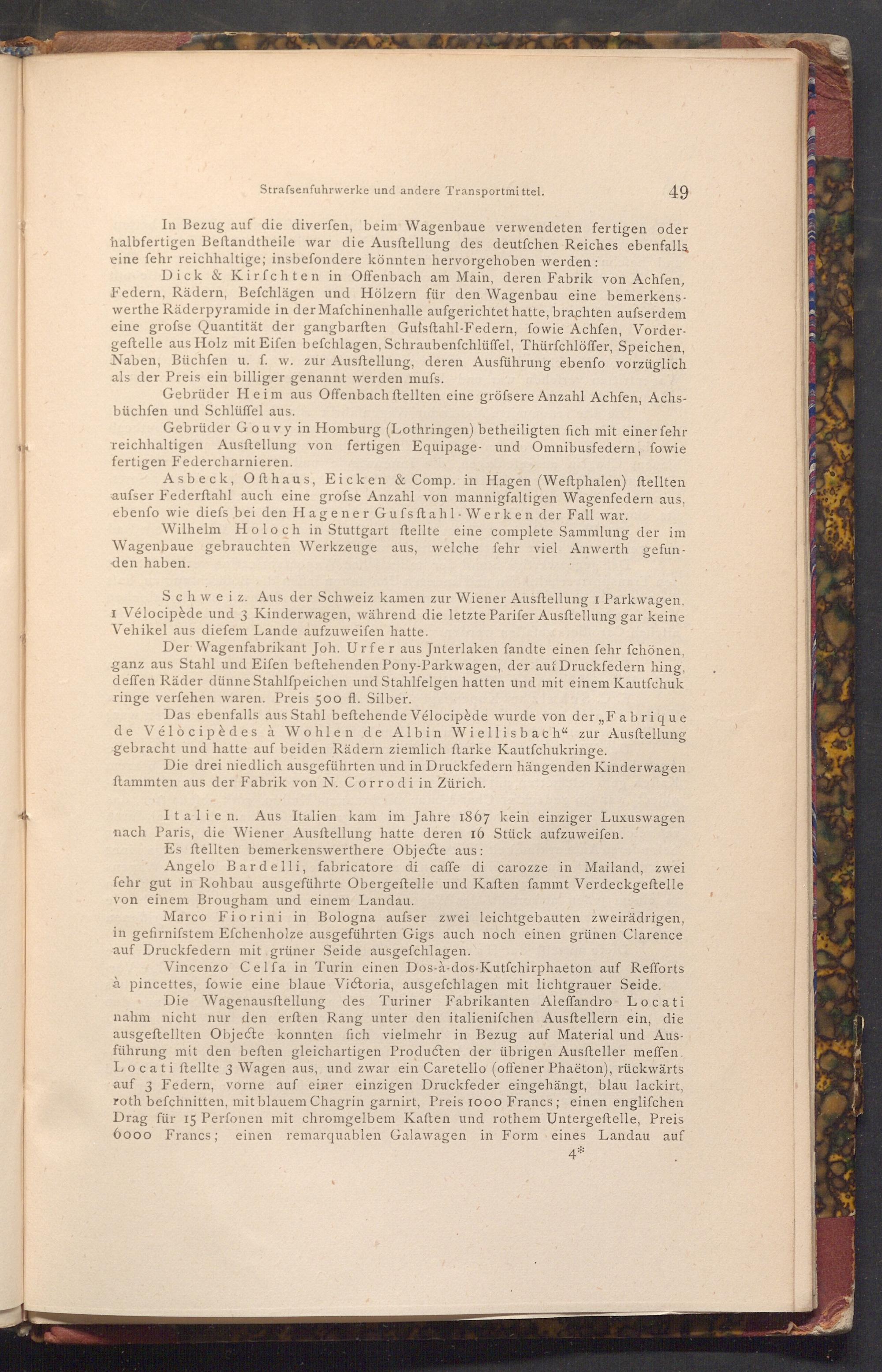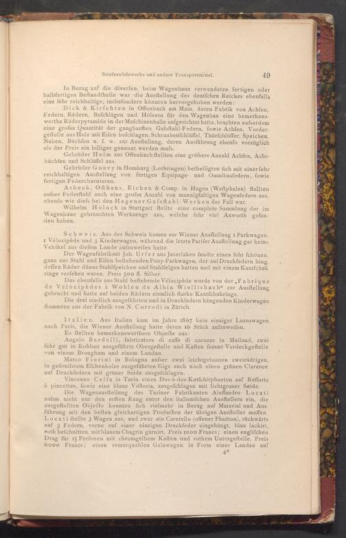 Die Wagenausftellung des Turiner Fabrikanten Aleffandro Locati nahm nicht nur den erften Rang unter den italienifchen Ausftellern ein, die ausgeftellten Objecte konnten fich vielmehr in Bezug auf Material und Ausführung mit den beften gleichartigen Producten der übrigen Ausfteller meffen. Locati ftellte 3 Wagen aus, und zwar ein Caretello( offener Phaëton), rückwärts auf 3 Federn, vorne auf einer einzigen Druckfeder eingehängt, blau lackirt, roth befchnitten, mit blauem Chagrin garnirt, Preis 1000 Francs; einen englifchen Drag für 15 Perfonen mit chromgelbem Kaften und rothem Untergeftelle, Preis 6000 Francs; einen remarquablen Galawagen in Form eines Landau auf