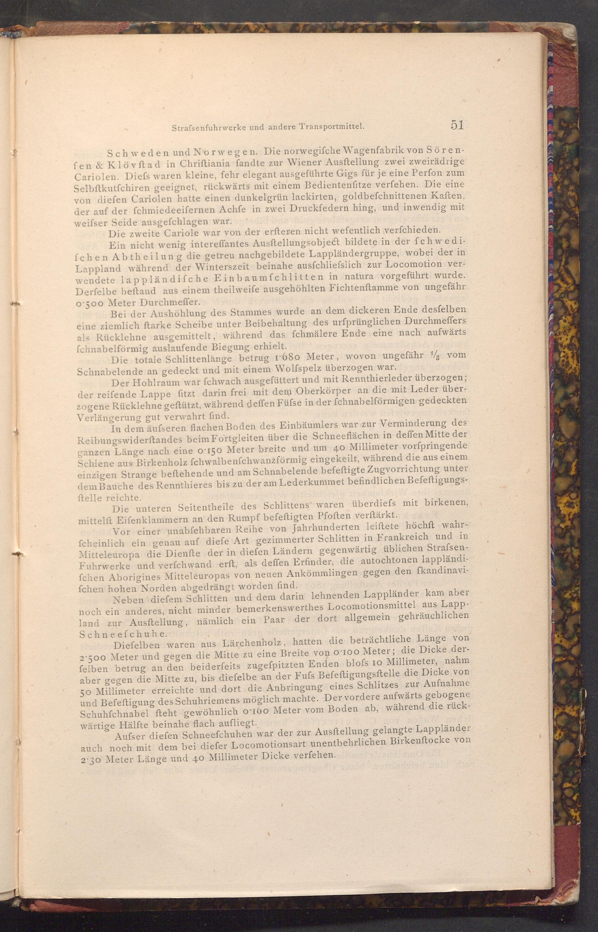 Die zweite Cariole war von der erfteren nicht wefentlich verfchieden. Ein nicht wenig intereffantes Ausftellungsobject bildete in der fchwedifchen Abtheilung die getreu nachgebildete Lappländergruppe, wobei der in Lappland während der Winterszeit beinahe ausfchliefslich zur Locomotion verwendete lap pländifche Einbaumfchlitten in natura vorgeführt wurde. Derfelbe beftand aus einem theilweife ausgehöhlten Fichtenftamme von ungefähr 0.500 Meter Durchmeffer. Myviais able
