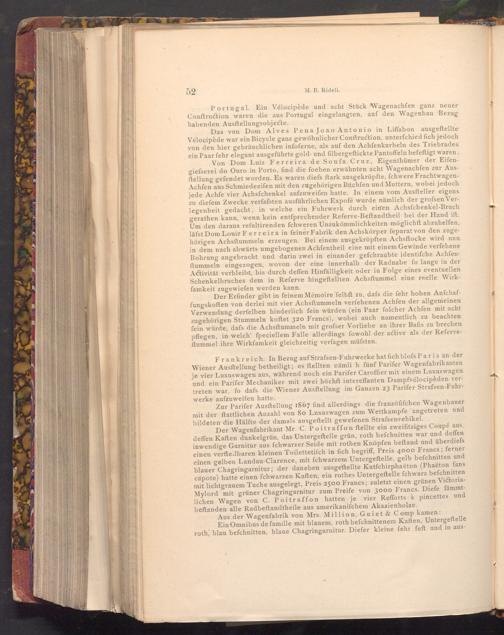 Frankreich. In Bezug auf Strafsen- Fuhrwerke hat fich blofs Paris an der Wiener Ausstellung betheiligt; es ftellten nämli h fünf Parifer Wagenfabrikanten je vier Luxuswagen aus, während noch ein Parifer Caroffier mit einem Luxuswagen und ein Parifer Mechaniker mit zwei höchft intereffanten Dampfvélocipèden vertreten war, fo dafs die Wiener Ausftellung im Ganzen 23 Parifer Strafsen- Fuhrwerke aufzuweifen hatte.