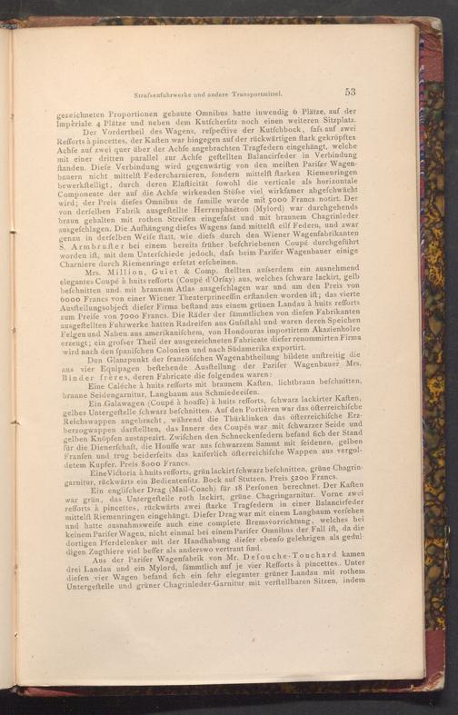 Mrs. Million, Guiet& Comp. ftellten aufserdem ein ausnehmend elegantes Coupé à huits refforts( Coupé d'Orfay) aus, welches fchwarz lackirt, gelb befchnitten und. mit braunem Atlas ausgefchlagen war und um den Preis von 6000 Francs von einer Wiener Theaterprinceffin erftanden worden ift; das vierte Ausftellungsobject diefer Firma beftand aus einem grünen Landau à huits refforts zum Preife von 7000 Francs. Die Räder der fämmtlichen von diefen Fabrikanten ausgeftellten Fuhrwerke hatten Radreifen aus Gufsftahl und waren deren Speichen Felgen und Naben aus amerikanifchem, von Hondouras importirtem Akazienholze erzeugt; ein grofser Theil der ausgezeichneten Fabricate diefer renommirten Firma wird nach den fpanifchen Colonien und nach Südamerika exportirt.