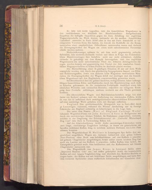 Nichtsdeftoweniger nahmen fie mit dem noch gegenwärtig aufrechtftehenden, fehr niederen Zolltarife vorlieb und fahen in Folge des freihändlerifchen Handelsvertrages ihre Induſtrie nicht nur nicht erfchüttert, diefelbe vielmehr fo gekräftigt aus dem Kampfe hervorgehen, dafs den englifchen Wagenbauern ein nicht unbedeutender Theil des früheren Abfatzgebietes entzogen werden konnte und gegenwärtig drei Viertel der fehr namhaften franzöfifchen Wagenproduction zu hohen Preifen im Auslande placirt werden.