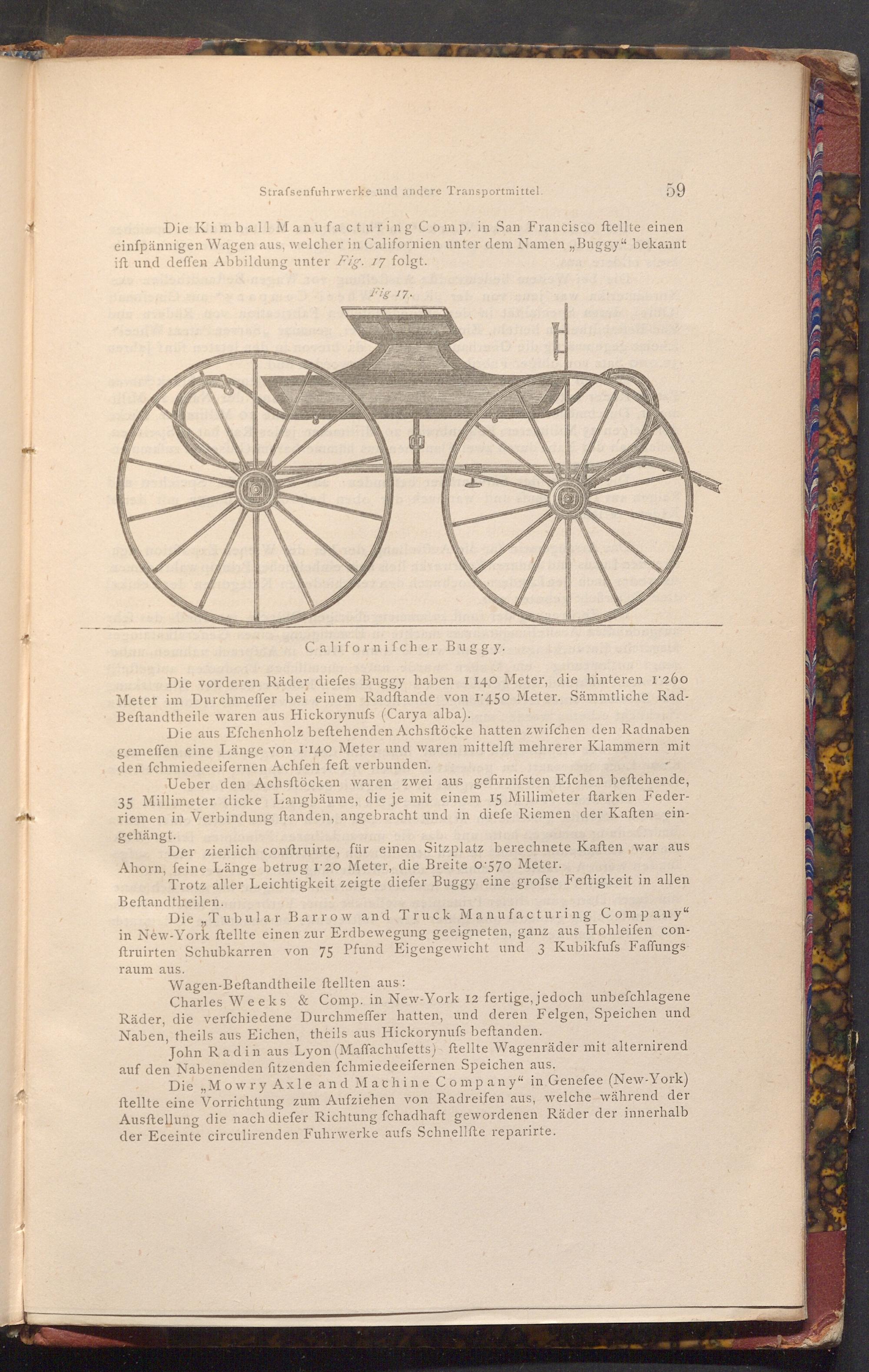 Die Kimball Manufacturing Comp. in San Francisco ftellte einen einfpännigen Wagen aus, welcher in Californien unter dem Namen ,, Buggy" bekannt ift und deffen Abbildung unter Fig. 17 folgt.
