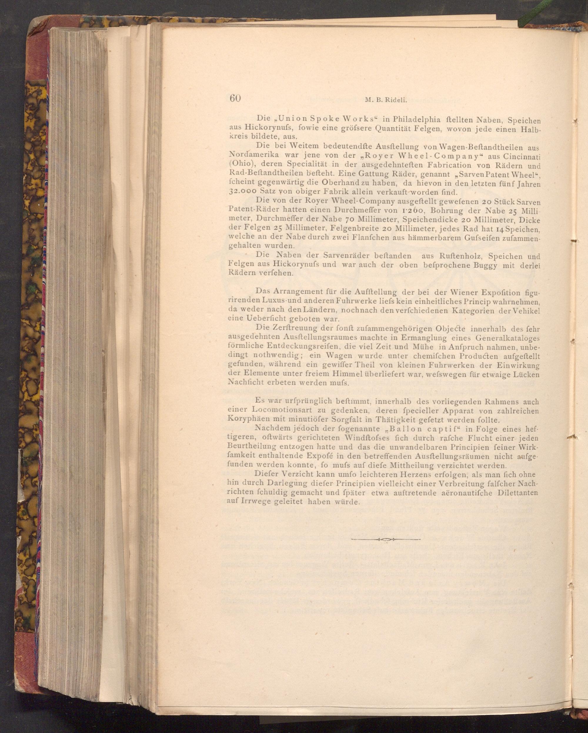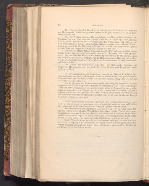 Die von der Royer Wheel- Company ausgeftellt gewefenen 20 Stück Sarven Patent- Räder hatten einen Durchmeffer von 1260, Bohrung der Nabe 25 Milli meter, Durchmeffer der Nabe 70 Millimeter, Speichendicke 20 Millimeter, Dicke der Felgen 25 Millimeter, Felgenbreite 20 Millimeter, jedes Rad hat 14 Speichen, welche an der Nabe durch zwei Flanfchen aus hämmerbarem Gufseifen zufammengehalten wurden.