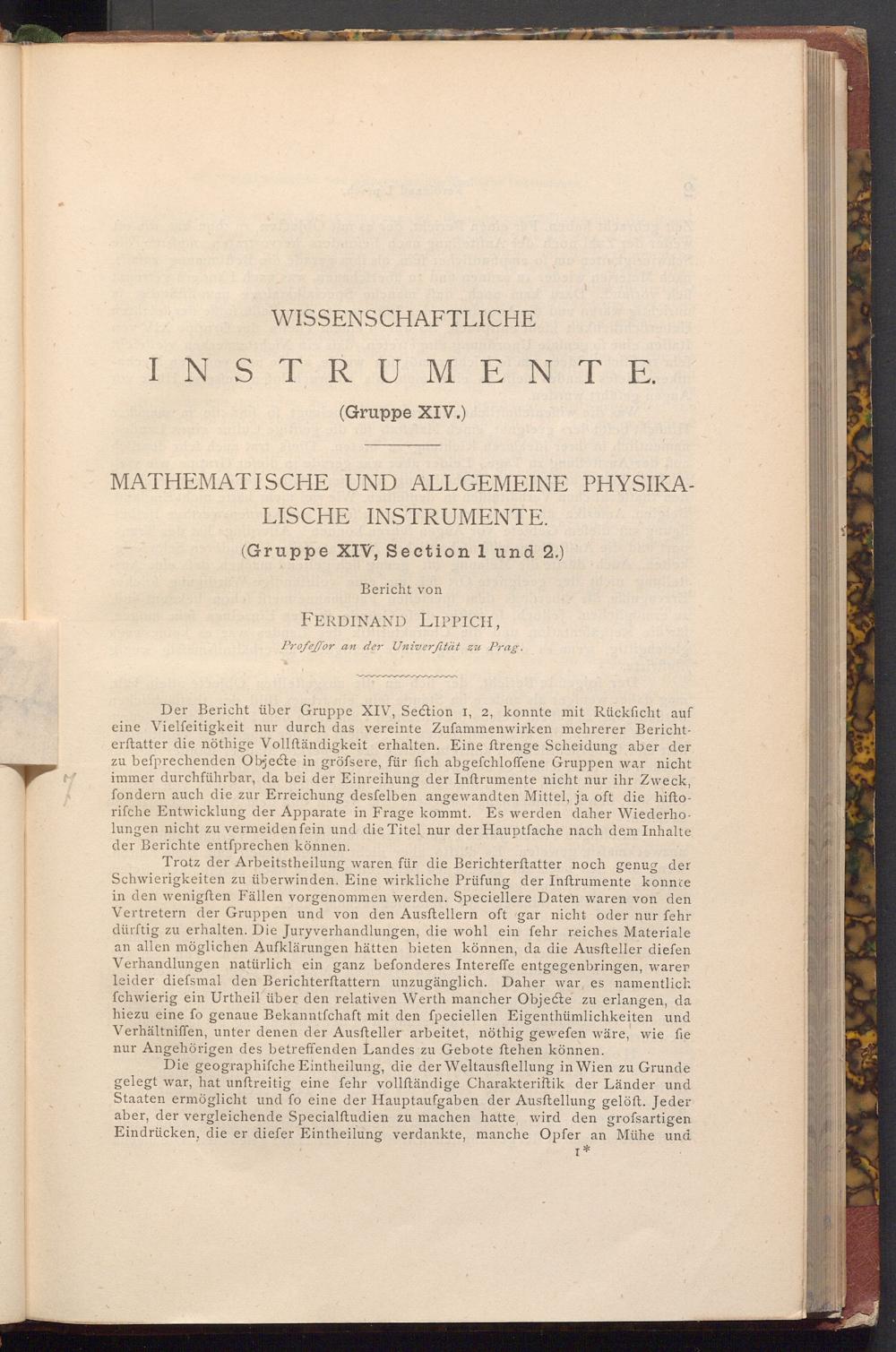 Der Bericht über Gruppe XIV, Section 1, 2, konnte mit Rückficht auf eine Vielfeitigkeit nur durch das vereinte Zufammenwirken mehrerer Berichterftatter die nöthige Vollständigkeit erhalten. Eine ftrenge Scheidung aber der zu befprechenden Objecte in gröfsere, für fich abgefchloffene Gruppen war nicht immer durchführbar, da bei der Einreihung der Inftrumente nicht nur ihr Zweck, fondern auch die zur Erreichung desfelben angewandten Mittel, ja oft die hiftorifche Entwicklung der Apparate in Frage kommt. Es werden daher Wiederholungen nicht zu vermeiden fein und die Titel nur der Hauptfache nach dem Inhalte der Berichte entſprechen können.