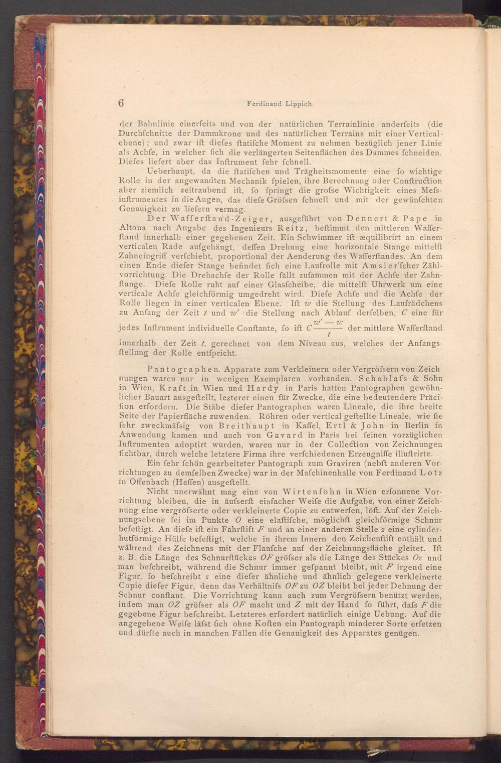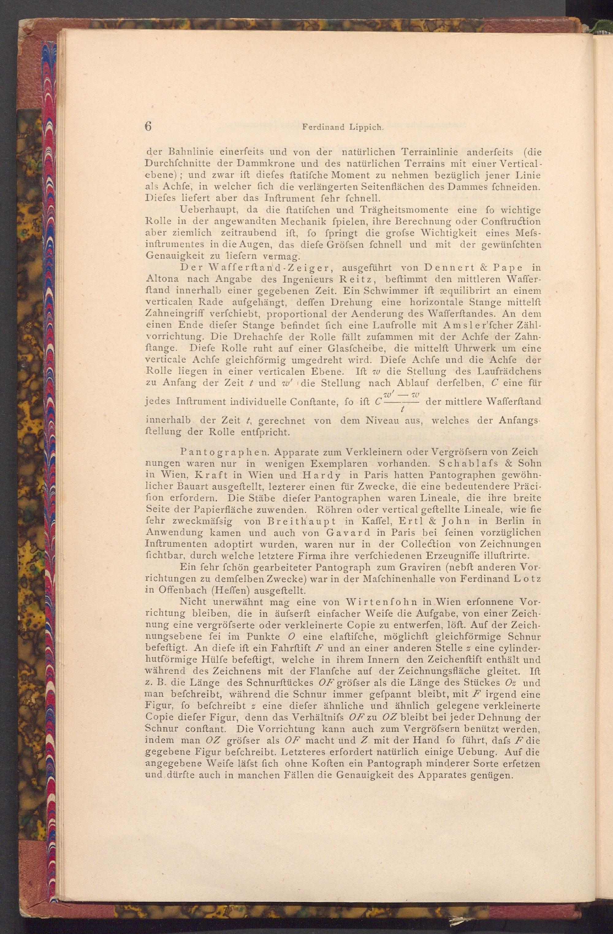 Der Wafferftand- Zeiger, ausgeführt von Dennert& Pape in Altona nach Angabe des Ingenieurs Reitz, beftimmt den mittleren Wafferftand innerhalb einer gegebenen Zeit. Ein Schwimmer ift æquilibrirt an einem verticalen Rade aufgehängt, deffen Drehung eine horizontale Stange mittelft Zahneingriff verfchiebt, proportional der Aenderung des Wafferftandes. An dem einen Ende diefer Stange befindet fich eine Laufrolle mit Amsler'fcher Zählvorrichtung. Die Drehachfe der Rolle fällt zufammen mit der Achfe der Zahnftange. Diefe Rolle ruht auf einer Glasfcheibe, die mittelft Uhrwerk um eine verticale Achfe gleichförmig umgedreht wird. Diefe Achfe und die Achfe der Rolle liegen in einer verticalen Ebene. Ift w die Stellung des Laufrädchens zu Anfang der Zeit t und w' die Stellung nach Ablauf derfelben, C eine für w' W jedes Inftrument individuelle Conftante, fo ift C. der mittlere Wafferftand innerhalb der Zeit t, gerechnet von dem Niveau aus, welches der Anfangs ftellung der Rolle entfpricht.