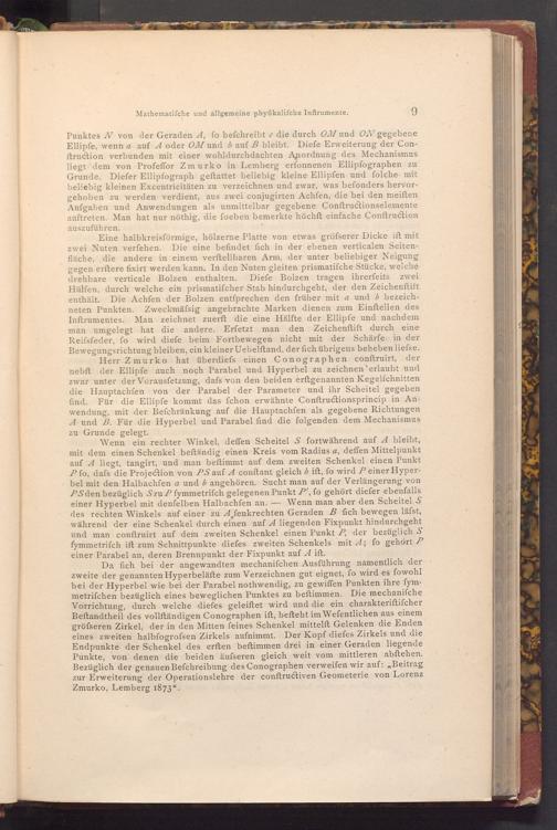 Punktes N von der Geraden A, fo befchreibt c die durch OM und ON gegebene Ellipfe, wenn a auf A oder OM und b auf B bleibt. Diefe Erweiterung der Conftruction verbunden mit einer wohldurchdachten Anordnung des Mechanismus liegt dem von Profeffor Z murko in Lemberg erfonnenen Ellipfographen zu Grunde. Diefer Ellipfograph geftattet beliebig kleine Ellipfen und folche mit beliebig kleinen Excentricitäten zu verzeichnen und zwar, was befonders hervorgehoben zu werden verdient, aus zwei conjugirten Achfen, die bei den meiften Aufgaben und Anwendungen als unmittelbar gegebene Conftructionselemente auftreten. Man hat nur nöthig, die foeben bemerkte höchft einfache Conftruction auszuführen.