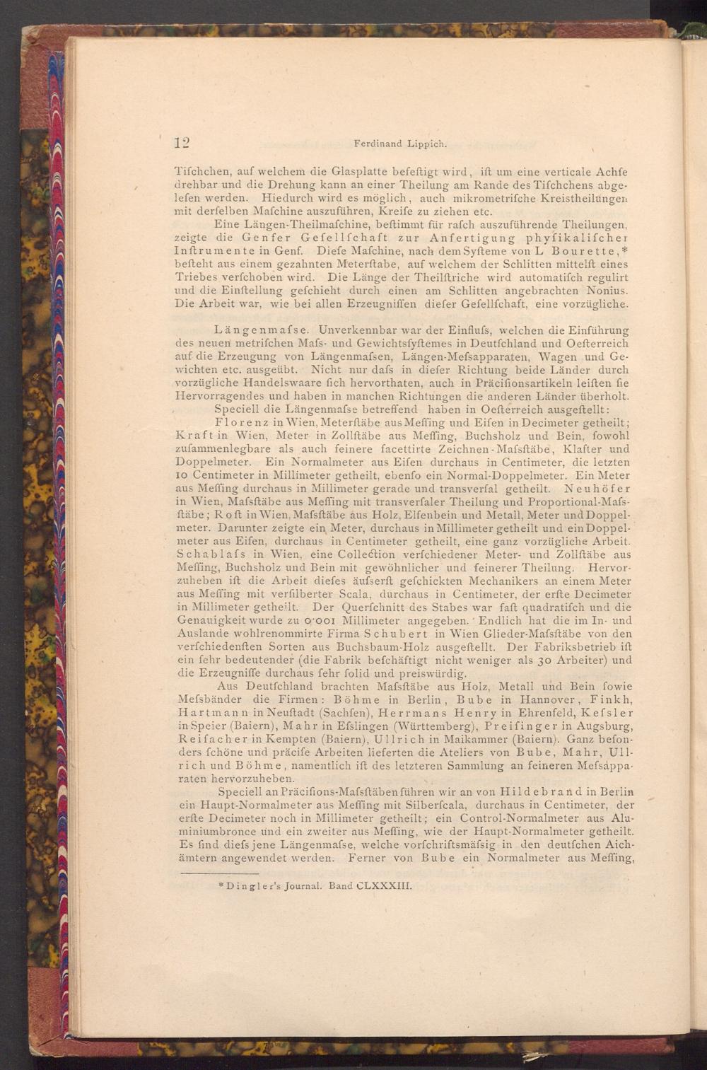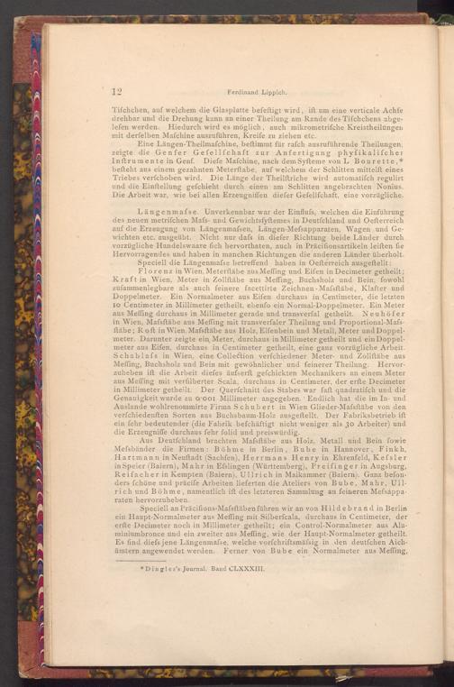 Längenmafse. Unverkennbar war der Einflufs, welchen die Einführung des neuen metrifchen Mafs- und Gewichtsfyftemes in Deutſchland und Oefterreich auf die Erzeugung von Längenmafsen, Längen- Mefsapparaten, Wagen und Gewichten etc. ausgeübt. Nicht nur dafs in diefer Richtung beide Länder durch vorzügliche Handelswaare fich hervorthaten, auch in Präcifionsartikeln leiften fie Hervorragendes und haben in manchen Richtungen die anderen Länder überholt. Speciell die Längenmafse betreffend haben in Oefterreich ausgeftellt: Florenz in Wien, Meterftäbe aus Meffing und Eifen in Decimeter getheilt; Kraft in Wien, Meter in Zollftäbe aus Meffing, Buchsholz und Bein, fowohl zufammenlegbare als auch feinere facettirte Zeichnen- Mafsftäbe, Klafter und Doppelmeter. Ein Normalmeter aus Eifen durchaus in Centimeter, die letzten 10 Centimeter in Millimeter getheilt, ebenfo ein Normal- Doppelmeter. Ein Meter aus Meffing durchaus in Millimeter gerade und transverfal getheilt. Neuhöfer in Wien, Mafsftäbe aus Meffing mit transverfaler Theilung und Proportional- Mafsftäbe; Roft in Wien, Mafsftäbe aus Holz, Elfenbein und Metall, Meter und Doppelmeter. Darunter zeigte ein Meter, durchaus in Millimeter getheilt und ein Doppelmeter aus Eifen, durchaus in Centimeter getheilt, eine ganz vorzügliche Arbeit. Schablafs in Wien, eine Collection verfchiedener Meter- und Zollftäbe aus Meffing, Buchsholz und Bein mit gewöhnlicher und feinerer Theilung. Hervorzuheben ist die Arbeit diefes äufserft gefchickten Mechanikers an einem Meter aus Meffing mit verfilberter Scala, durchaus in Centimeter, der erfte Decimeter in Millimeter getheilt. Der Querfchnitt des Stabes war faft quadratifch und die Genauigkeit wurde zu o'001 Millimeter angegeben. Endlich hat die im In- und Auslande wohlrenommirte Firma Schubert in Wien Glieder- Mafsftäbe von den verfchiedenften Sorten aus Buchsbaum- Holz ausgeftellt. Der Fabriksbetrieb ift ein fehr bedeutender( die Fabrik befchäftigt nicht weniger als 30 Arbeiter) und die Erzeugniffe durchaus fehr folid und preiswürdig.