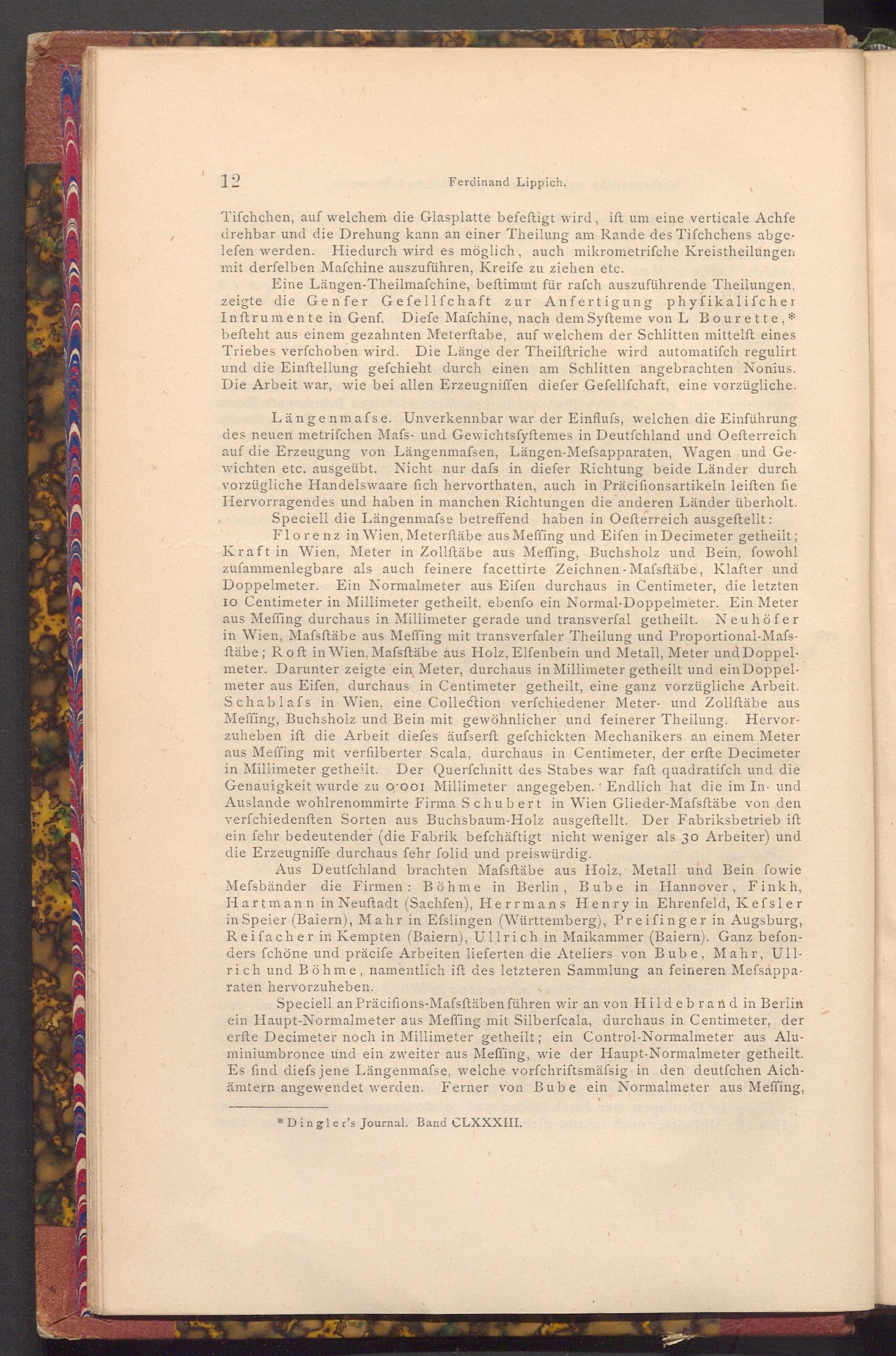 Speciell an Präcifions- Mafsftäben führen wir an von Hildebrand in Berlin ein Haupt- Normalmeter aus Meffing mit Silberfcala, durchaus in Centimeter, der erfte Decimeter noch in Millimeter getheilt; ein Control- Normalmeter aus Aluminiumbronce und ein zweiter aus Meffing, wie der Haupt- Normalmeter getheilt. Es find diefs jene Längenmafse, welche vorfchriftsmäfsig in den deutfchen Aichämtern angewendet werden. Ferner von Bube ein Normalmeter aus Meffing,