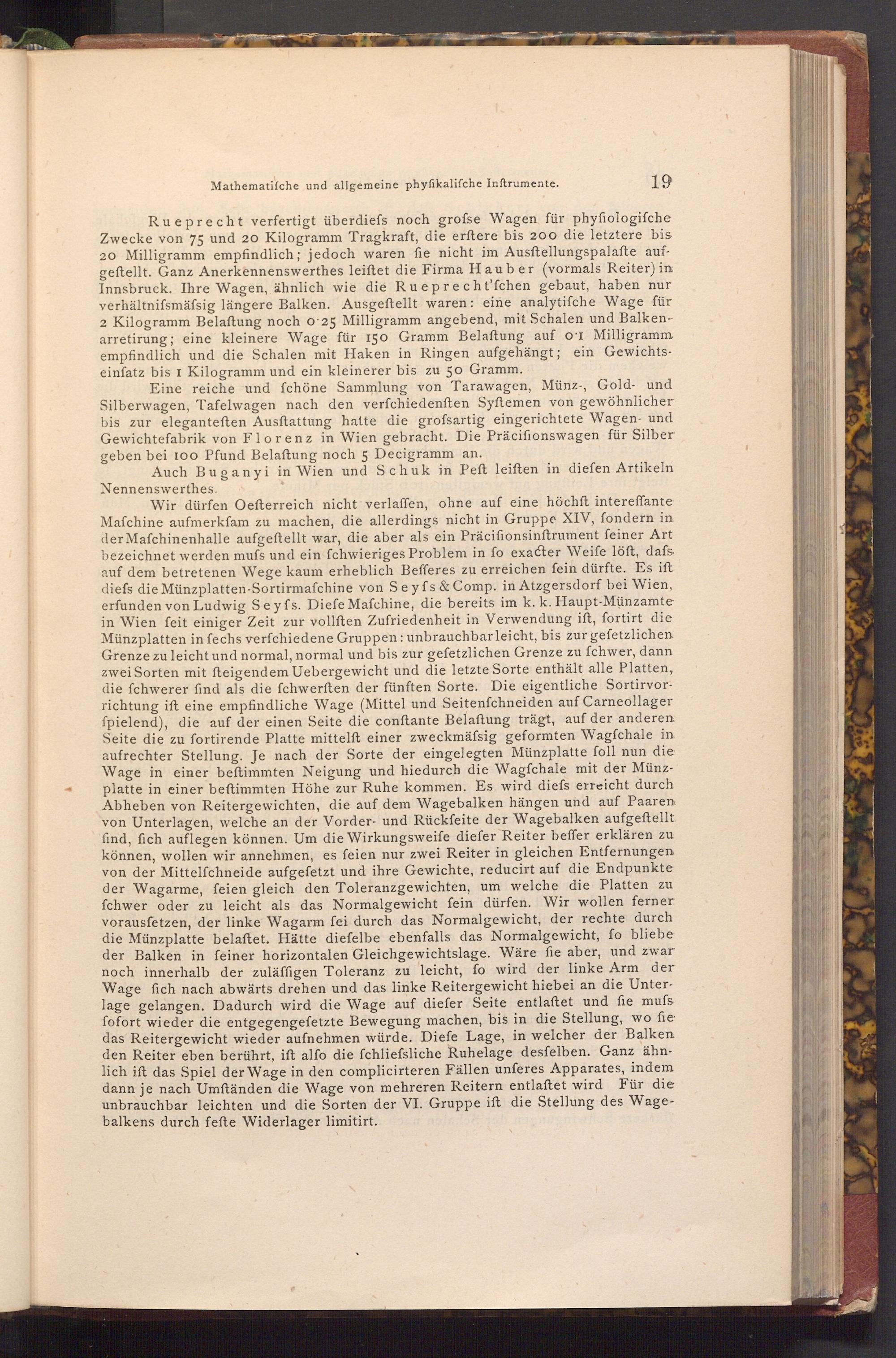 Rueprecht verfertigt überdiefs noch grofse Wagen für phyfiologifche Zwecke von 75 und 20 Kilogramm Tragkraft, die erftere bis 200 die letztere bis 20 Milligramm empfindlich; jedoch waren fie nicht im Ausftellungspalafte aufgeftellt. Ganz Anerkennenswerthes leiftet die Firma Hauber( vormals Reiter) in Innsbruck. Ihre Wagen, ähnlich wie die Rueprecht'fchen gebaut, haben nur verhältnifsmäfsig längere Balken. Ausgeftellt waren: eine analytifche Wage für 2 Kilogramm Belaftung noch o 25 Milligramm angebend, mit Schalen und Balkenarretirung; eine kleinere Wage für 150 Gramm Belaftung auf o'1 Milligramm empfindlich und die Schalen mit Haken in Ringen aufgehängt; ein Gewichtseinfatz bis I Kilogramm und ein kleinerer bis zu 50 Gramm.