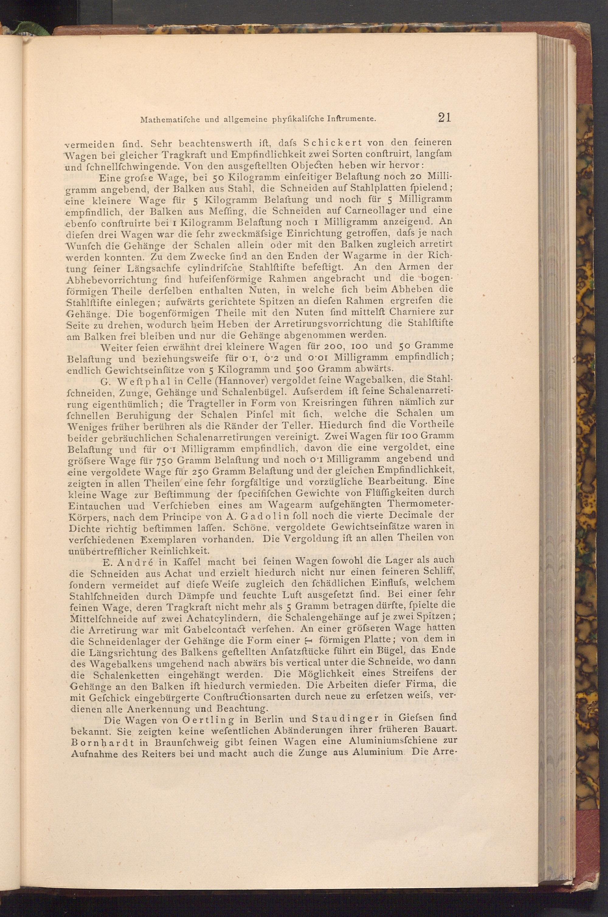 E. André in Kaffel macht bei feinen Wagen fowohl die Lager als auch die Schneiden aus Achat und erzielt hiedurch nicht nur einen feineren Schliff, fondern vermeidet auf diefe Weife zugleich den fchädlichen Einflufs, welchem Stahlfchneiden durch Dämpfe und feuchte Luft ausgefetzt find. Bei einer fehr feinen Wage, deren Tragkraft nicht mehr als 5 Gramm betragen dürfte, ſpielte die Mittelfchneide auf zwei Achat cylindern, die Schalengehänge auf je zwei Spitzen; die Arretirung war mit Gabelcontact verfehen. An einer gröfseren Wage hatten die Schneidenlager der Gehänge die Form einer förmigen Platte; von dem in die Längsrichtung des Balkens geftellten Anfatzftücke führt ein Bügel, das Ende des Wagebalkens umgehend nach abwärs bis vertical unter die Schneide, wo dann die Schalenketten eingehängt werden. Die Möglichkeit eines Streifens der Gehänge an den Balken ift hiedurch vermieden. Die Arbeiten diefer Firma, die mit Gefchick eingebürgerte Conftructionsarten durch neue zu erfetzen weifs, verdienen alle Anerkennung und Beachtung.
