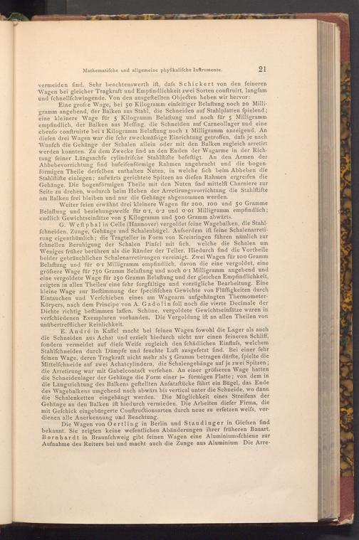 G. Weftphal in Celle( Hannover) vergoldet feine Wagebalken, die Stahlfchneiden, Zunge, Gehänge und Schalenbügel. Ausserdem ift feine Schalenarretirung eigenthümlich; die Tragteller in Form von Kreisringen führen nämlich zur welche die Schalen um fchnellen Beruhigung der Schalen Pinfel mit fich, Weniges früher berühren als die Ränder der Teller. Hiedurch find die Vortheile beider gebräuchlichen Schalenarretirungen vereinigt. Zwei Wagen für 100 Gramm Belaftung und für o'I Milligramm empfindlich, davon die eine vergoldet, eine gröfsere Wage für 750 Gramm Belaftung und noch o'r Milligramm angebend und eine vergoldete Wage für 250 Gramm Belaftung und der gleichen Empfindlichkeit, zeigten in allen Theilen eine fehr forgfältige und vorzügliche Bearbeitung. Eine kleine Wage zur Beftimmung der fpecififchen Gewichte von Flüffigkeiten durch Eintauchen und Verfchieben eines am Wagearm aufgehängten ThermometerKörpers, nach dem Principe von A. Gadolin foll noch die vierte Decimale der Dichte richtig beftimmen laffen. Schöne, vergoldete Gewichtseinfätze waren in verfchiedenen Exemplaren vorhanden. Die Vergoldung ift an allen Theilen von unübertrefflicher Reinlichkeit.