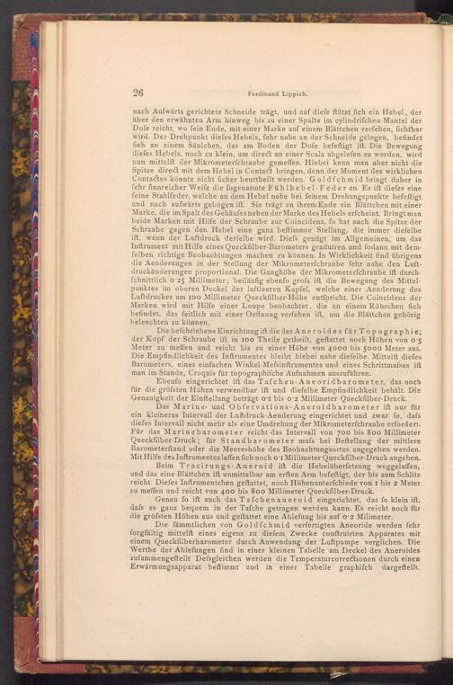 Genau fo ift auch das Tafchenaneroid eingerichtet, das fo klein ift, dafs es ganz bequem in der Tafche getragen werden kann. Es reicht noch für die gröfsten Höhen aus und geftattet eine Ablefung bis auf o 2 Milimeter.