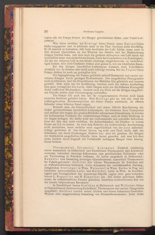 Thermometer, Pyrometer, Aräometer. Ziemlich reichhaltig waren namentlich in Oefterreich und Deutfchland Thermometer und Aräometer vertreten, befonders derartige Inftrumente zum gewöhnlichen Gebrauche oder zur Verwendung in Fabriken beftimmt. So haben ausgeftellt in Oefterreich: Neuhöfer eine Sammlung derartiger Glasinftrumente, namentlich Thermometer fur Fabriksgebrauch; Gottlieb fehr fchöne Thermometer für Fabriken und zu wiffenfchaftlichem Gebrauch, fowie Aräometer der verfchiedenften Gattung; defsgleichen Stettinger in Wien, Weinzierl in Wien, Batka in Prag und befonders hervorzuheben Lafer und Hetfchel, beide in Wien. An Reichhaltigkeit und Vorzüglichkeit der exponirten Objecte ragten aber ganz befonders hervor L. Kappeller und H. Kappeller jun. Die hieher gehörigen Inftrumente für wiffenfchaftliche Zwecke geniefsen denfelben wohlverdienten Ruf wie die bereits befprochenen Barometer.