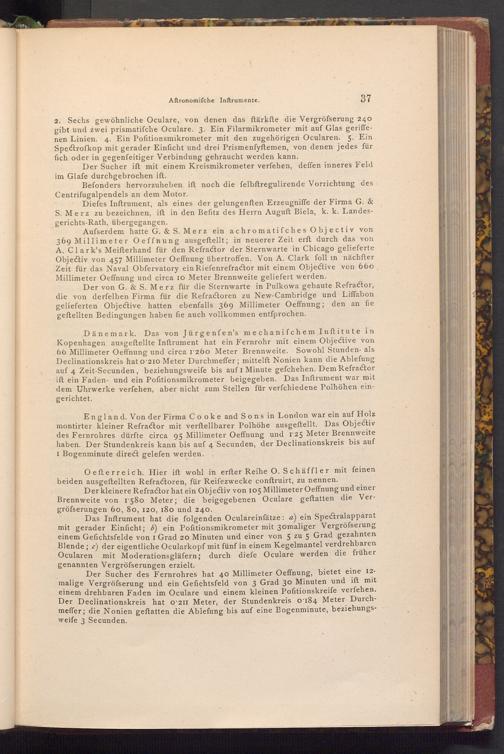 Aufserdem hatte G.& S. Merz ein achromatifches Objectiv von 369 Millimeter Oeffnung ausgeftellt; in neuerer Zeit erft durch das von A, Clark's Meifterhand für den Refractor der Sternwarte in Chicago gelieferte Objectiv von 457 Millimeter Oeffnung übertroffen. Von A. Clark foll in nächfter Zeit für das Naval Obfervatory ein Riefenrefractor mit einem Objective von 660 Millimeter Oeffnung und circa 10 Meter Brennweite geliefert werden.