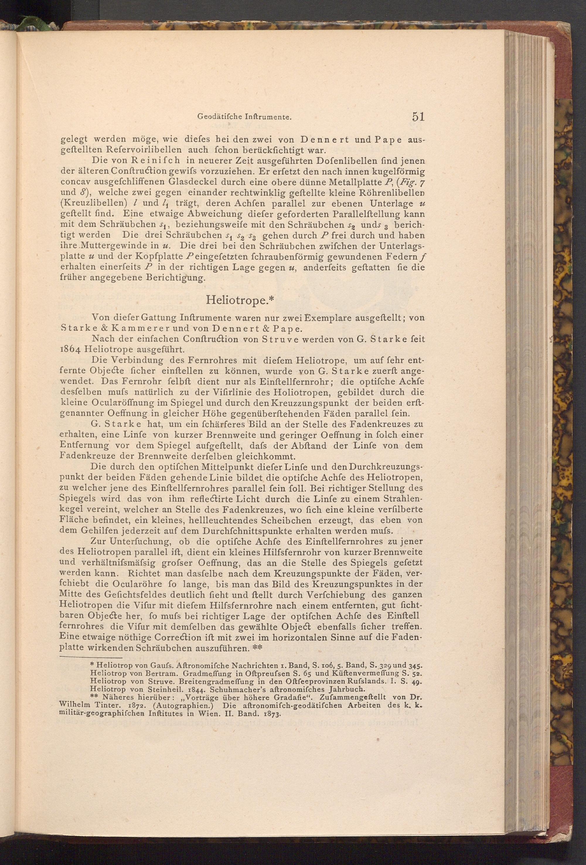* Heliotrop von Gaufs. Aftronomifche Nachrichten 1. Band, S. 106, 5. Band, S. 329 und 345. Heliotrop von Bertram. Gradmeffung in Oftpreufsen S. 65 und Küftenvermeffung S. 52. Heliotrop von Struve. Breitengradmeffung in den Oftfeeprovinzen Rufslands. I. S. 49. Heliotrop von Steinheil. 1844. Schuhmacher's aftronomifches Jahrbuch.