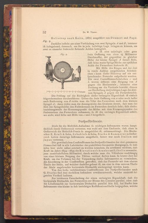 Die gewöhnlichen Conftructionen des Perfpectivlineales der drei genannten Firmen find faft in alle Lehrbücher der praktifchen Geometrie übergangen, fo dafs felbe hier nicht näher erörtert zu werden brauchen. Zu erwähnen verdient, dafs Kraft im Jahre 1834-1835 die Elevationsfchraube und Libelle anwandte, jene unentbehrlichen Hilfsmittel, durch welche man die Vifirebene unabhängig von einer kleinen Neigung des Tifches vertical ftellen kann. In letzter Zeit hat Kraft, um das Volumen bei der Verpackung diefes Inftrumentes zu vermindern, die Anordnung in der Conftruction getroffen, dafs das Fernrohr mit dem oberen Theile der Säule, auf welcher dasfelbe gebaut ift, um eine in dem unteren Theile der Säule angebrachte horizontale Drehachfe niedergelegt werden kann.