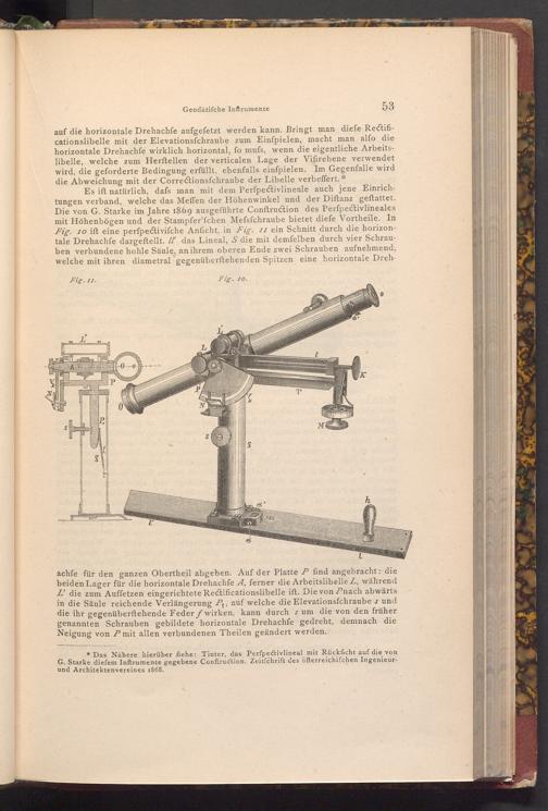 Es ift natürlich, dafs man mit dem Perfpectivlineale auch jene Einrichtungen verband, welche das Meffen der Höhenwinkel und der Diftanz geftattet. Die von G. Starke im Jahre 1869 ausgeführte Conftruction des Perfpectivlineales mit Höhenbögen und der Stampfer'fchen Mefsfchraube bietet diefe Vortheile. In Fig. 10 ift eine perfpectivifche Anficht, in Fig. 11 ein Schnitt durch die horizontale Drehachfe dargeftellt. Il' das Lineal, S die mit demfelben durch vier Schrauben verbundene hohle Säule, an ihrem oberen Ende zwei Schrauben aufnehmend, welche mit ihren diametral gegenüberftehenden Spitzen eine horizontale Dreh