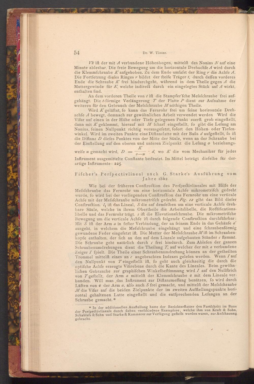 Wie bei der früheren Conftruction des Perfpectivlineales mit Hilfe der Mefsfchraube das Fernrohr um eine horizontale Achfe mikrometriſch gedreht wurde, fo wird bei der vorliegenden Conftruction das Fernrohr um eine verticale Achfe mit der Mefsfchraube mikrometriſch gedreht. Fig. 12 gibt das Bild diefer Conftruction. ₁ ift das Lineal, S die auf demfelben um eine verticale Achfe drehbare Säule, welche in ihrem Obertheile die Arbeitslibelle, die Rectificationslibelle und das Fernrohr trägt. s ift die Elevationsfchraube. Die mikrometrifche Bewegung um die verticale Achfe ift durch folgende Conftruction durchführbar: Mit S ift der Arm a in fefter Verbindung, der an feinem Ende in das Gehäuſe a' ausgeht, in welchem die Mefsfchraube eingehängt und eine fchraubenförmig gewundene Feder eingefetzt ift. Die Mutter der Mefsfchraube Mift im Schraubenkopfe enthalten, der fich an den auf dem Lineale aufgebauten Ständer c ftemmt. Die Schraube geht natürlich durch c frei hindurch. Zum Ablefen der ganzen Schraubenumdrehungen dient die Theilung T, auf welcher der mit a verbundene Zeiger I fpielt. Die Theile einer Schraubenumdrehung können an der getheilten Trommel mittelft eines an c angebrachten Indexes gelefen werden. Wenn/ auf den Nullpunkt von Teingeftellt ift, fo geht auch gleichzeitig die durch die optifche Achfe erzeugte Vifirebene durch die Kante des Lineales. Beim gewöhnlichen Gebrauche zur graphifchen Winkelbeftimmung wird I auf den Nullftrich von Tgeftellt, der Arm a mittelft der Klemmfchraube σ mit dem Lineale ver bunden. Will man das Inftrument zur Diftanzmeffung benützen, fo wird durch Lüften von der Arm a, alfo auch S frei gemacht, und mittelft der Mefsfchraube M die Vifur auf die beiden Zielpunkte der im zweiten Aufftellungspunkte horizontal gehaltenen Latte eingeftellt und die entſprechenden Lefungen an der Schraube gemacht.*