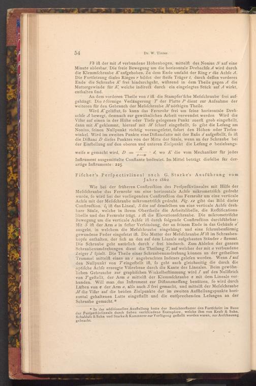 Vk ift der mit A verbundene Höhenbogen, mittelft des Nonius N auf eine Minute ablesbar. Die freie Bewegung um die horizontale Drehachfe A wird durch die Klemmfchraube K aufgehoben. Zu dem Ende umfafst der Ring die Achfe A. Die Fortsetzung diefes Ringes r bildet der fteife Träger t, durch deffen vorderes Ende die Schraube K frei hindurchgeht, während in dem Theile gegen A die Muttergewinde für K, welche indirect durch ein eingelegtes Stück auf A wirkt, enthalten find.