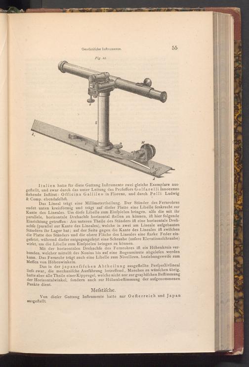 Das in der japanefifchen Abtheilung ausgeftellte Perfpectivlineal liefs zwar, die mechanifche Ausführung betreffend, Manches zu wünfchen übrig, hatte aber alle Theile einer Kippregel, welche nicht nur zur graphifchen Beftimmung der Horizontalwinkel, fondern auch zur Höhenbeftimmung der aufgenommenen Punkte dient.
