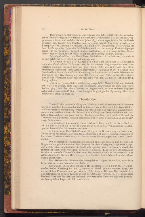 Die Firma Starke& Kammerer hatte ein Exemplar des Mefstifches nach der Conftruction G. Starke, wie, fie feit Anfang 1873 ausgeführt wird, ausgeftellt; diefelbe zeichnet fich vor jener im 1. Hefte der Zeitfchrift des öfterreichifchen Ingenieur- und Architektenvereines, Jahrgang 1860, befchriebenen Conftruction durch die einfache Klemmung und die ficher wirkende MikrometerBewegung der Kreisbewegung des Tifchblattes aus. Näheres hierüber findet man in den Vorträgen über niedere Geodäfie von Dr. W. Tinter. 1873 und 1874Autographien.
