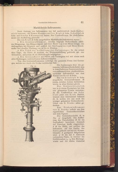 Das von Schablafs& Sohn ausgeftellte Grubeninftrument ift jenem, welches foeben befchrieben wurde, in allen Stücken gleich. Grubentheodolith war in je einem Exemplare bei den vier genannten Firmen vertreten; da die Conftruction von Scha blafs jener von Kraft ähnlich, letztere aber hinreichend bekannt ift, fo wollen wir nur noch des weniger gekannten Grubentheodolithen von G. Starke näher gedenken.