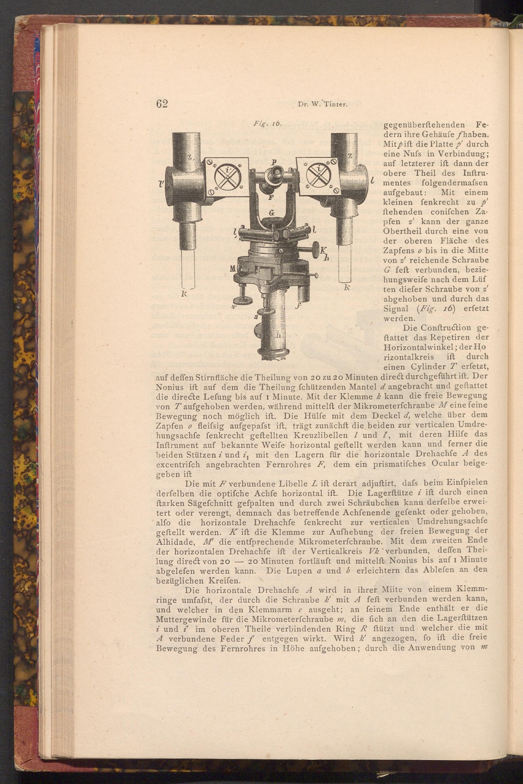 Die mit verbundene Libelle L ift derart adjuftirt, dafs beim Einfpielen derfelben die optifche Achfe horizontal ift. Die Lagerftütze i ift durch einen ftarken Sägefchnitt gefpalten und durch zwei Schräubchen kann derfelbe erweitert oder verengt, demnach das betreffende Achfenende gefenkt oder gehoben, alfo die horizontale Drehachfe fenkrecht zur verticalen Umdrehungsachfe geftellt werden. K ift die Klemme zur Aufhebung der freien Bewegung der Alhidade, M die entſprechende Mikrometerfchraube. Mit dem zweiten Ende der horizontalen Drehachfe ift der Verticalkreis Vk verbunden, deffen Theilung direct von 2020 Minuten fortläuft und mittelft Nonius bis auf 1 Minute abgelefen werden kann. Die Lupen a und 6 erleichtern das Ablefen an den bezüglichen Kreifen.