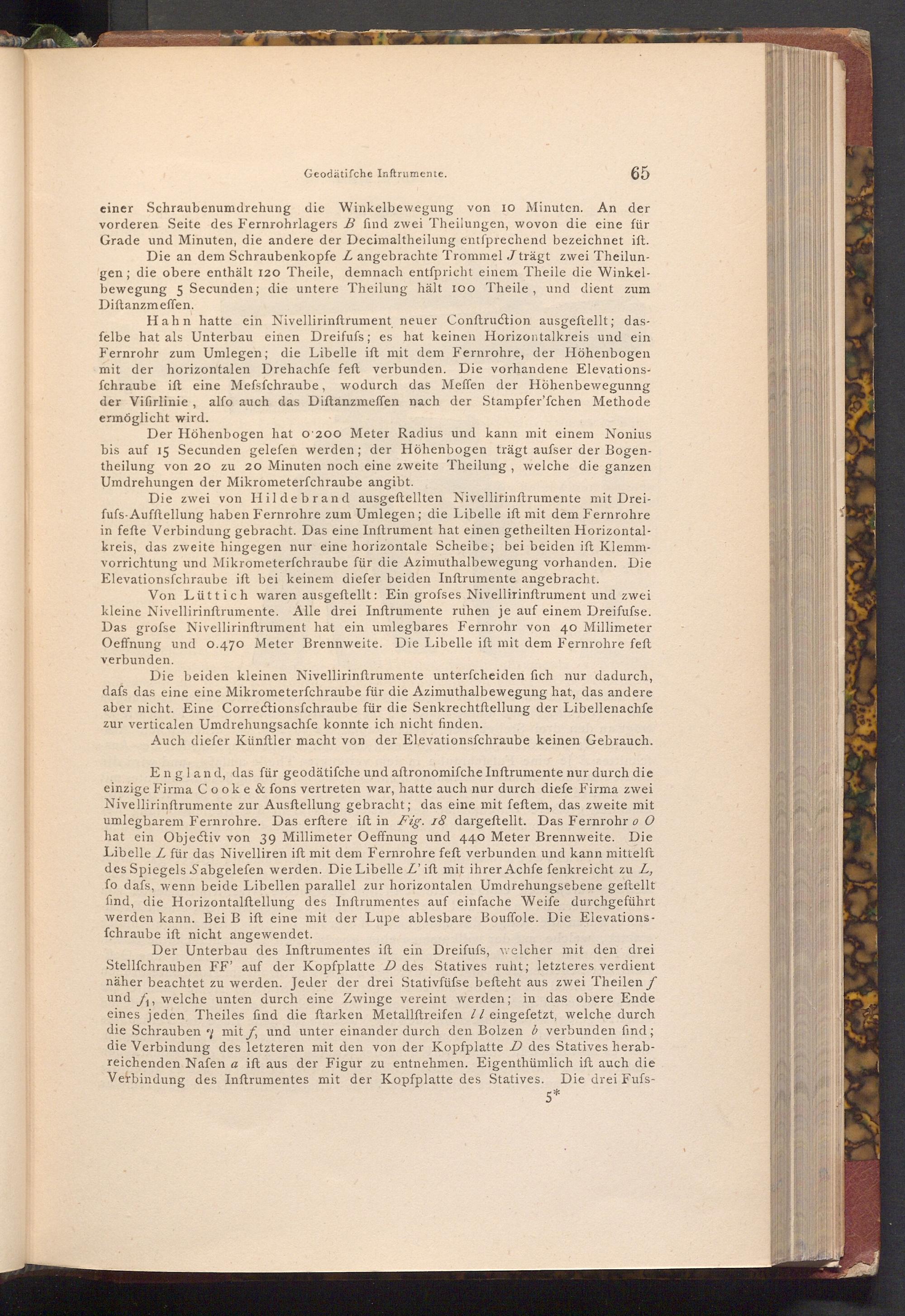 Hahn hatte ein Nivellirinftrument neuer Conftruction ausgeftellt; dasfelbe hat als Unterbau einen Dreifufs; es hat keinen Horizontalkreis und ein Fernrohr zum Umlegen; die Libelle ift mit dem Fernrohre, der Höhenbogen mit der horizontalen Drehachfe feft verbunden. Die vorhandene Elevationsfchraube iſt eine Mefsfchraube, wodurch das Meffen der Höhenbewegunng der Vifirlinie, alfo auch das Diftanzmeffen nach der Stampfer'fchen Methode ermöglicht wird.