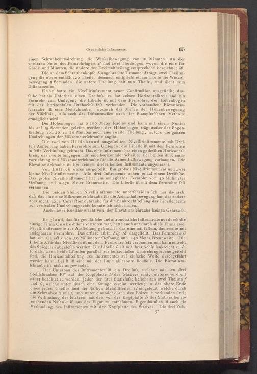 Die zwei von Hildebrand ausgeftellten Nivellirinftrumente mit Dreifufs- Aufftellung haben Fernrohre zum Umlegen; die Libelle ift mit dem Fernrohre in fefte Verbindung gebracht. Das eine Inftrument hat einen getheilten Horizontalkreis, das zweite hingegen nur eine horizontale Scheibe; bei beiden ift Klemmvorrichtung und Mikrometerfchraube für die Azimuthalbewegung vorhanden. Die Elevationsfchraube ift bei keinem diefer beiden Inftrumente angebracht.
