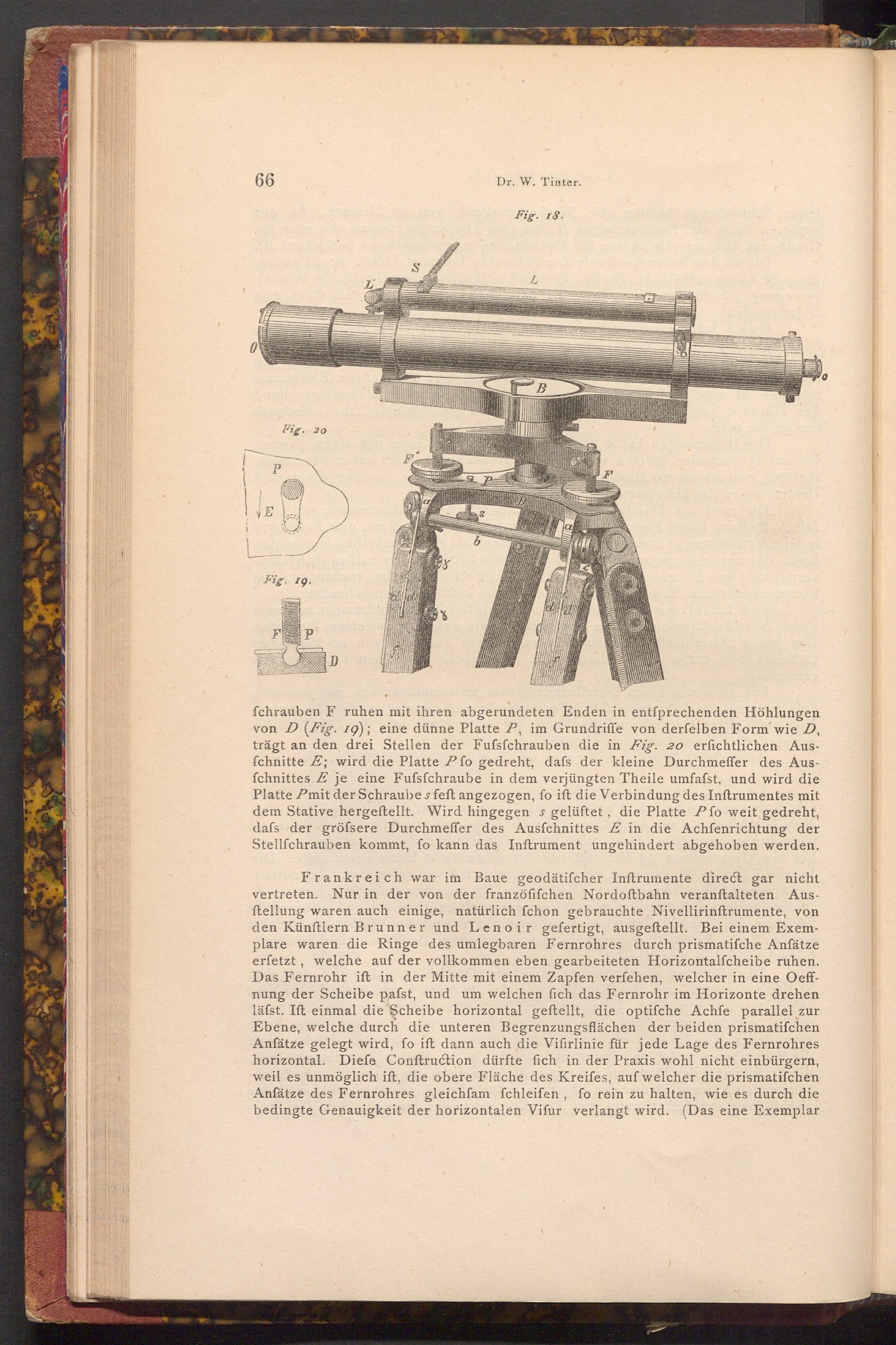 Frankreich war im Baue geodätifcher Inftrumente direct gar nicht vertreten. Nur in der von der franzöfifchen Nordoftbahn veranſtalteten Ausftellung waren auch einige, natürlich fchon gebrauchte Nivellirinftrumente, von den Künftlern Brunner und Lenoir gefertigt, ausgeftellt. Bei einem Exemplare waren die Ringe des umlegbaren Fernrohres durch prismatifche Anfätze erfetzt, welche auf der vollkommen eben gearbeiteten Horizontalfcheibe ruhen. Das Fernrohr ift in der Mitte mit einem Zapfen verfehen, welcher in eine Oeffnung der Scheibe pafst, und um welchen fich das Fernrohr im Horizonte drehen läfst. Ift einmal die Scheibe horizontal geftellt, die optifche Achfe parallel zur Ebene, welche durch die unteren Begrenzungsflächen der beiden prismatifchen Anfätze gelegt wird, fo ift dann auch die Vifirlinie für jede Lage des Fernrohres horizontal. Diefe Conftruction dürfte fich in der Praxis wohl nicht einbürgern, weil es unmöglich ift, die obere Fläche des Kreifes, auf welcher die prismatifchen Anfätze des Fernrohres gleichfam fchleifen, fo rein zu halten, wie es durch die bedingte Genauigkeit der horizontalen Vifur verlangt wird.( Das eine Exemplar