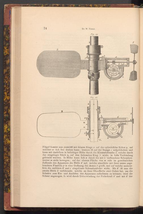 Flügel kommt nun zunächft mit feinem Ringe n auf die cylindrifche Röhre P, auf welcher er fich frei drehen kann; letztere ift auf der Stange s aufgefchoben und kann mit derfelben in beliebiger Höhe durch die Klemmfchraube S, welche durch das eingelegte Stück n, auf den federnden Ring wirkt, in fefte Verbindung gebracht werden. In Höhe kann fich n durch die mit verbundene Schraubenmutter m nicht bewegen; auf der oberen Fläche von m ruht im gewöhnlichen Zuftande des Apparates die Hülfe h' auf, welche einerfeits mit ihrer unten angebrachten Flanfche p in eine Oeffnung des Armes b greift, und auf welche andererfeits die zwifchen h' und i eingefetzte Schraubenfeder wirkt. Mit h' ift nun die zweite Hülfe h verfchraubt, welche an ihrer Oberfläche zwei Oehre hat, um die Schnüre zum Ein- und Auslöfen des Apparates aufnehmen zu können; wird die Schnur angezogen, fo wird durch Ueberwindung der Federkraft h' und mit h' der