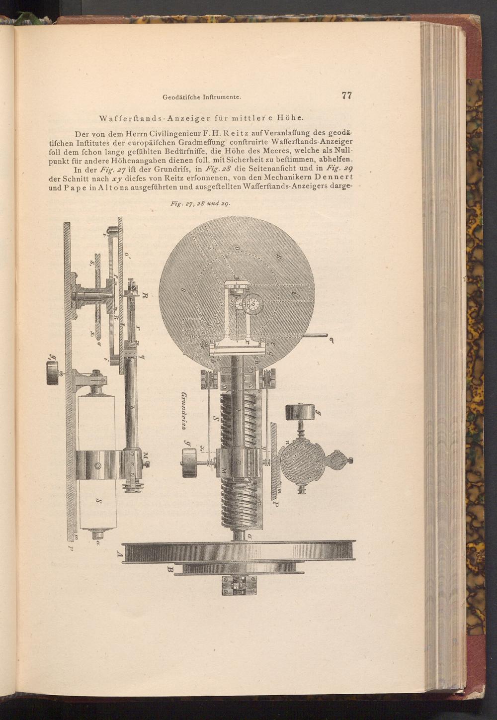 Der von dem Herrn Civilingenieur F. H. Reitz auf Veranlaffung des geodätifchen Inftitutes der europäiſchen Gradmeffung conftruirte Wafferftands- Anzeiger foll dem fchon lange gefühlten Bedürfniffe, die Höhe des Meeres, welche als Nullpunkt für andere Höhenangaben dienen foll, mit Sicherheit zu beftimmen, abhelfen. In der Fig. 27 ift der Grundrifs, in Fig. 28 die Seitenanficht und in Fig. 29 der Schnitt nach xy diefes von Reitz erfonnenen, von den Mechanikern Dennert und Pape in Altona ausgeführten und ausgeftellten Wafferftands- Anzeigers dargeFig. 27, 28 und 29.