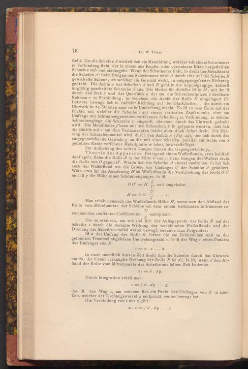 ftellt. Um die Scheibe A wickelt fich ein Metalldraht, welcher mit einem Schwimmer in Verbindung fteht, der in einem aus Kupfer oder verzinktem Eiſen hergefteilten Schachte auf- und niedergeht. Wenn der Schwimmer finkt, fo dreht der Metalldraht die Scheibe A; beim Steigen des Schwimmers wird A durch eine auf die Scheibe B gewickelte Schnur, an welcher ein Gewicht wirkt, in entgegengefetzter Richtung gedreht. Die Achfe a der Scheiben A und B geht in die doppelgängige, äufserft forgfältig gearbeitete Schraube S aus. Die Mutter für diefelbe ift in M; mit ihr ift durch den Stab 6 und das Querftück q der um die Schraubenfpitzen e drehbare Rahmen in Verbindung, in welchem die Achfe der Rolle R eingelagert ift. Letztere bewegt fich in radialer Richtung auf der Glasfcheibe s, die durch ein Uhrwerk in 24 Stunden eine volle Umdrehung macht. Es ift zu dem Ende mit der Büchfe, mit welcher die Scheibe s auf einem verticalen Zapfen ruht, eine am Umfange mit Schraubengewinden verfehenen Scheibes, in Verbindung, in welche Schraubengänge die Schraube σ eingreift, die eben durch das Uhrwerk gedreht wird. Die Metallfeder fkann mit den Schrauben k fo gefpannt werden, dafs fich die Büchfe mit s um den Verticalzapfen leicht aber doch ficher dreht. Die Führung der Schraubenmutter wird durch den Anfatz n( Fig. 29), der fich durch das entgegenwirkende Gewicht g an die mit einer fcharfen, parallel zur Achfe von S geftellten Kante verfehene Metallplatte m lehnt, bewerkstelliget.