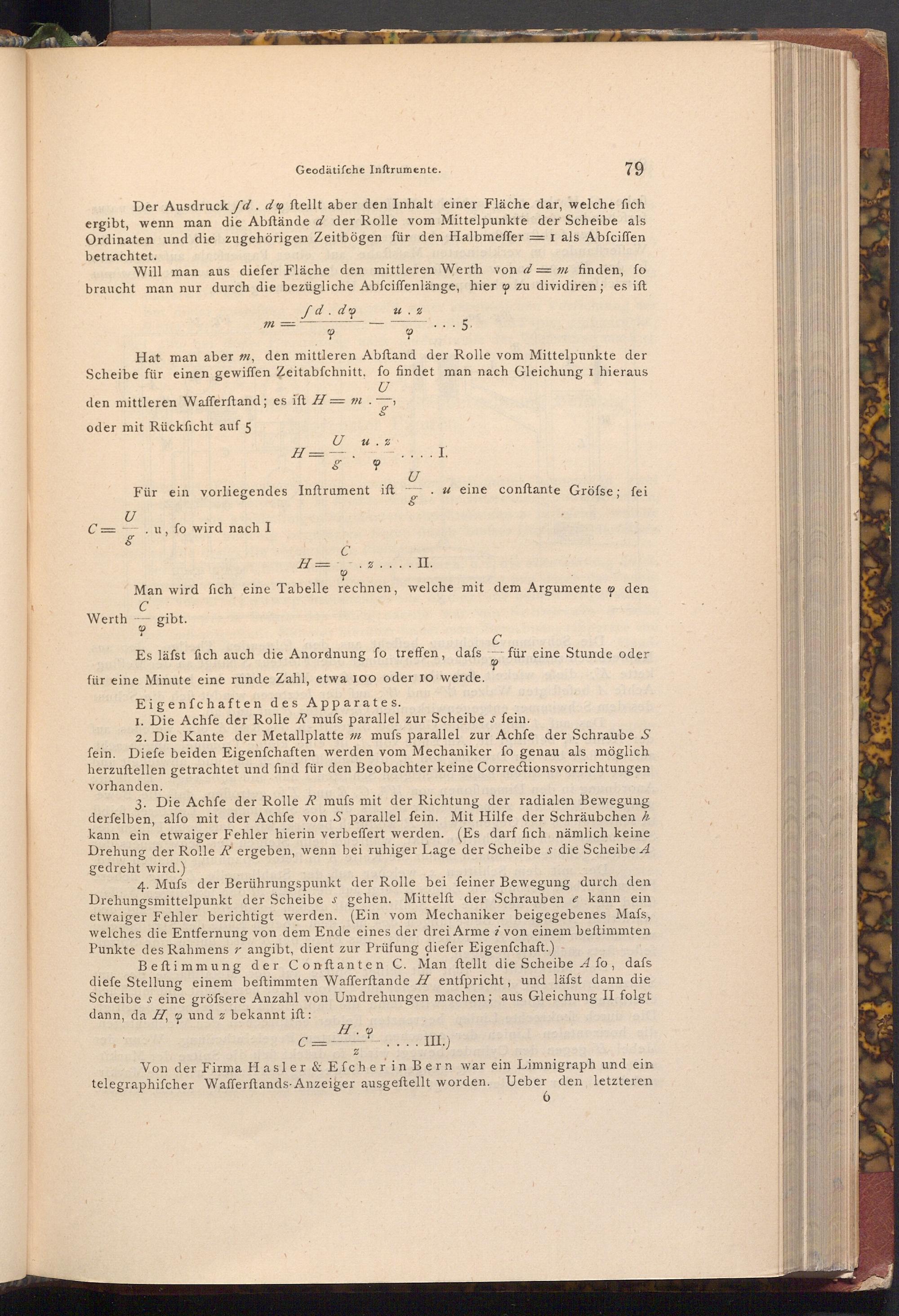 Beftimmung der Conftanten C. Man ftellt die Scheibe A fo, dafs diefe Stellung einem beftimmten Wafferftande H entspricht, und läfst dann die Scheibe s eine gröfsere Anzahl von Umdrehungen machen; aus Gleichung II folgt dann, da H, und z bekannt ift: