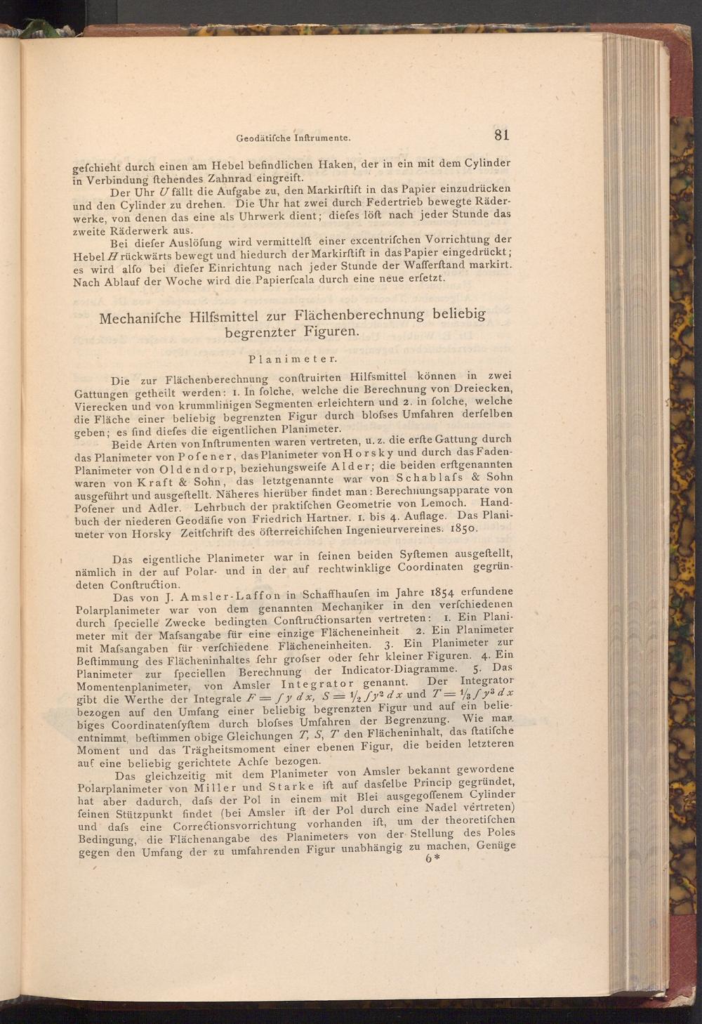 Beide Arten von Inftrumenten waren vertreten, u. z. die erfte Gattung durch das Planimeter von Pofener, das Planimeter von Horsky und durch das FadenPlanimeter von Oldendorp, beziehungsweife Alder; die beiden erftgenannten waren von Kraft& Sohn, das letztgenannte war von Schablafs& Sohn. ausgeführt und ausgeftellt. Näheres hierüber findet man: Berechnungsapparate von Pofener und Adler. Lehrbuch der praktifchen Geometrie von Lemoch. Handbuch der niederen Geodäfie von Friedrich Hartner. I. bis 4. Auflage. Das Planimeter von Horsky Zeitfchrift des öfterreichifchen Ingenieurvereines. 1850.