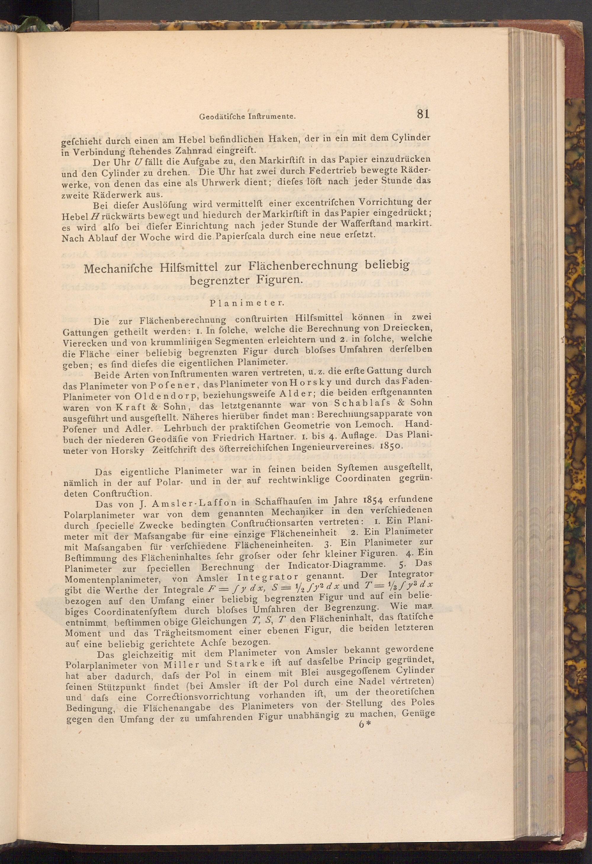 Das von J. Amsler- Laffon in Schaffhaufen im Jahre 1854 erfundene Polarplanimeter war von von dem genannten Mechaniker in den verfchiedenen durch ſpecielle Zwecke bedingten Conftructionsarten vertreten: meter mit der Mafsangabe für eine einzige Flächeneinheit. mit Mafsangaben für verfchiedene Flächeneinheiten. Beftimmung des Flächeninhaltes fehr grofser oder fehr kleiner Figuren. 4. Ein Planimeter zur fpeciellen Berechnung der Indicator- Diagramme. Momentenplanimeter, von Amsler Integrator genannt. gibt die Werthe der Integrale F= fy dx, S= 2/ y2 dx und T= 13/ y3d x bezogen auf den Umfang einer beliebig begrenzten Figur und auf ein beliebiges Coordinatenfyftem durch blofses Umfahren der Begrenzung. entnimmt, beftimmen obige Gleichungen T, S, T den Flächeninhalt, das ftatifche Moment und das Trägheitsmoment einer ebenen Figur, die beiden letzteren auf eine beliebig gerichtete Achfe bezogen.