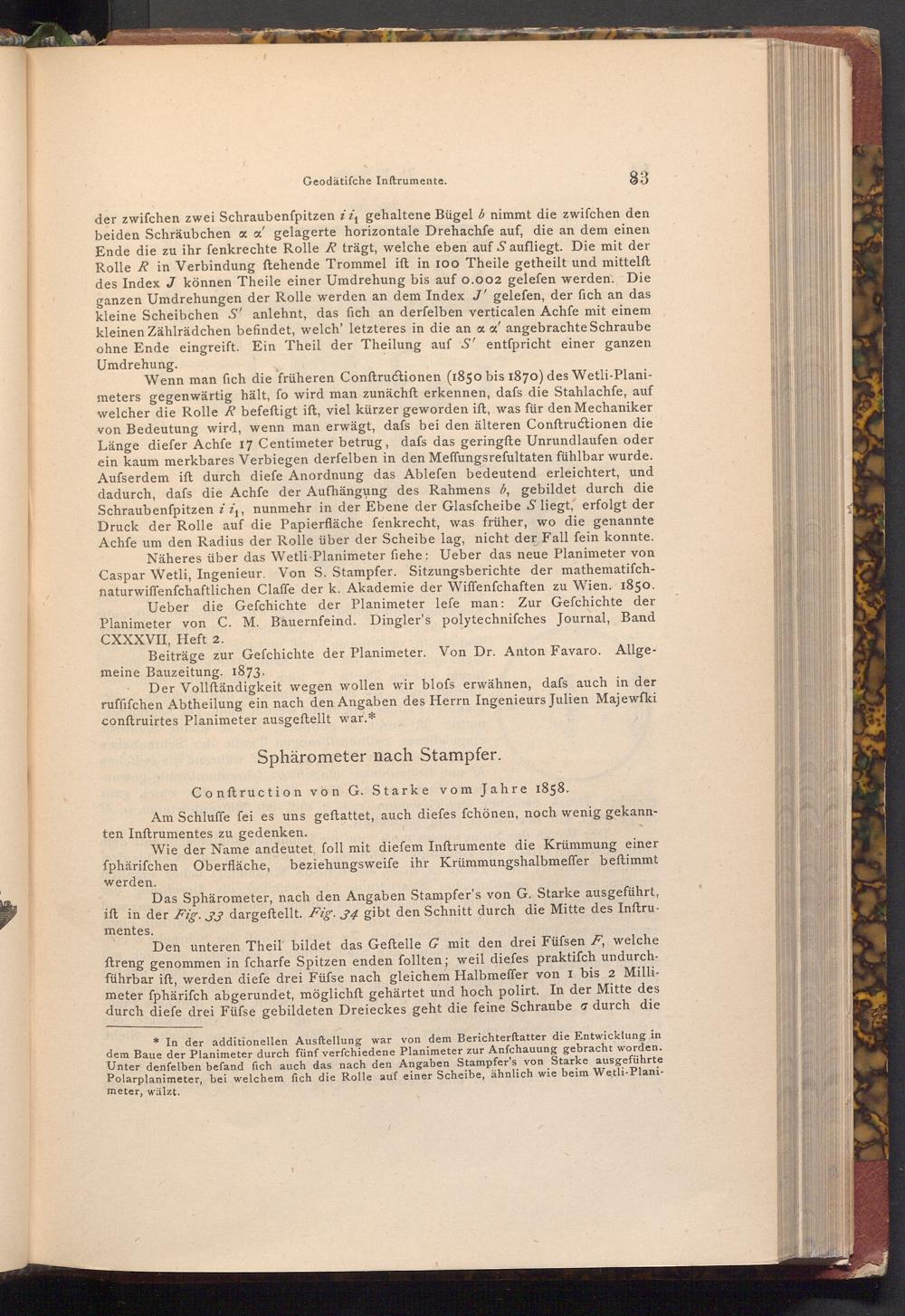 Wenn man fich die früheren Conftructionen( 1850 bis 1870) des Wetli- Planimeters gegenwärtig hält, fo wird man zunächft erkennen, dafs die Stahlachfe, auf welcher die Rolle R befeftigt ift, viel kürzer geworden ift, was für den Mechaniker von Bedeutung wird, wenn man erwägt, dafs bei den älteren Conftructionen die Länge diefer Achfe 17 Centimeter betrug, dafs das geringfte Unrundlaufen oder ein kaum merkbares Verbiegen derfelben in den Meffungsrefultaten fühlbar wurde. Aufserdem ift durch diefe Anordnung das Ablefen bedeutend erleichtert, und dadurch, dafs die Achfe der Aufhängung des Rahmens b, gebildet durch die Schraubenfpitzen i i₁, nunmehr in der Ebene der Glasfcheibe S liegt, erfolgt der Druck der Rolle auf die Papierfläche fenkrecht, was früher, wo die genannte Achfe um den Radius der Rolle über der Scheibe lag, nicht der Fall fein konnte. Näheres über das Wetli- Planimeter fiehe: Ueber das neue Planimeter von Caspar Wetli, Ingenieur. Von S. Stampfer. Sitzungsberichte der mathematiſchnaturwiffenfchaftlichen Claffe der k. Akademie der Wiffenfchaften zu Wien. 1850.