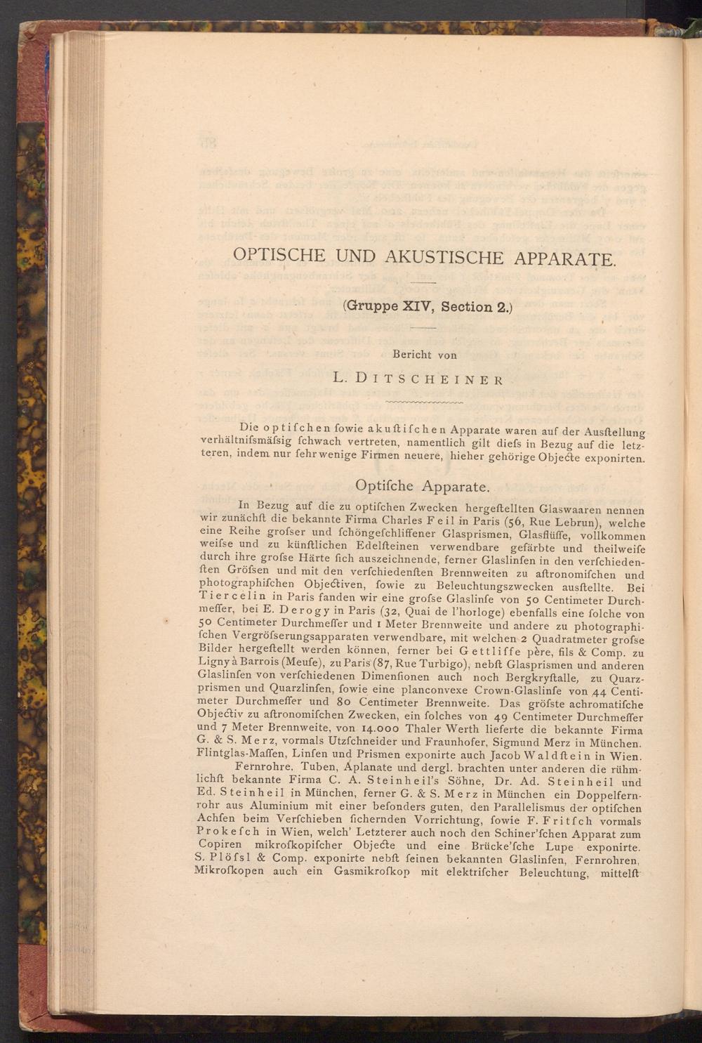 In Bezug auf die zu optifchen Zwecken hergeſtellten Glaswaaren nennen wir zunächft die bekannte Firma Charles Feil in Paris( 56, Rue Lebrun), welche eine Reihe grofser und fchöngefchliffener Glasprismen, Glasflüffe, vollkommen weifse und zu künftlichen Edelſteinen verwendbare gefärbte und theilweife durch ihre grofse Härte fich auszeichnende, ferner Glaslinfen in den verfchiedenften Gröfsen und mit den verfchiedenften Brennweiten zu aftronomifchen und photographifchen Objectiven, fowie zu Beleuchtungszwecken ausftellte. Bei Tiercelin in Paris fanden wir eine grofse Glaslinfe von 50 Centimeter Durchmeffer, bei E. Derogy in Paris( 32, Quai de l'horloge) ebenfalls eine folche von 50 Centimeter Durchmeffer und 1 Meter Brennweite und andere zu photographifchen Vergröfserungsapparaten verwendbare, mit welchen 2 Quadratmeter grofse Bilder hergeftellt werden können, ferner bei Gettliffe père, fils& Comp. zu Ligny à Barrois( Meufe), zu Paris( 87, Rue Turbigo), nebft Glasprismen und anderen Glaslinfen von verfchiedenen Dimenfionen auch noch Bergkryftalle, zu Quarzprismen und Quarzlinfen, fowie eine planconvexe Crown- Glaslinfe von 44 Centimeter Durchmeffer und 80 Centimeter Brennweite. Das gröfste achromatifche Objectiv zu aftronomifchen Zwecken, ein folches von 49 Centimeter Durchmeffer und 7 Meter Brennweite, von 14.000 Thaler Werth lieferte die bekannte Firma G.& S. Merz, vormals Utzfchneider und Fraunhofer, Sigmund Merz in München. Flintglas- Maffen, Linfen und Prismen exponirte auch Jacob Waldftein in Wien. Fernrohre, Tuben, Aplanate und dergl. brachten unter anderen die rühmlichft bekannte Firma C. A. Steinheil's Söhne, Dr. Ad. Steinheil und Ed. Steinheil in München, ferner G.& S. Merz in München ein Doppelfernrohr aus Aluminium mit einer befonders guten, den Parallelismus der optifchen Achfen beim Verſchieben fichernden Vorrichtung, fowie F. Fritfch vormals Prokefch in Wien, welch' Letzterer auch noch den Schiner'fchen Apparat zum Copiren mikrofkopifcher Objecte und eine Brücke'fche Lupe exponirte. S. Plöfsl& Comp. exponirte nebft feinen bekannten Glaslinfen, Fernrohren, Mikrofkopen auch ein Gasmikrofkop mit elektrifcher Beleuchtung, mittelft