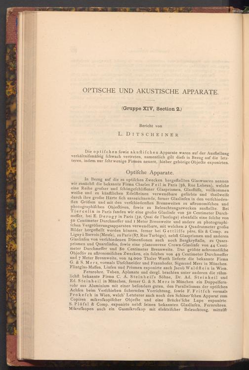 Die optifchen fowie akuftifchen Apparate waren auf der Ausftellung verhältnifsmäfsig fchwach vertreten, namentlich gilt diefs in Bezug auf die letzteren, indem nur fehr wenige Firmen neuere, hieher gehörige Objecte exponirten.
