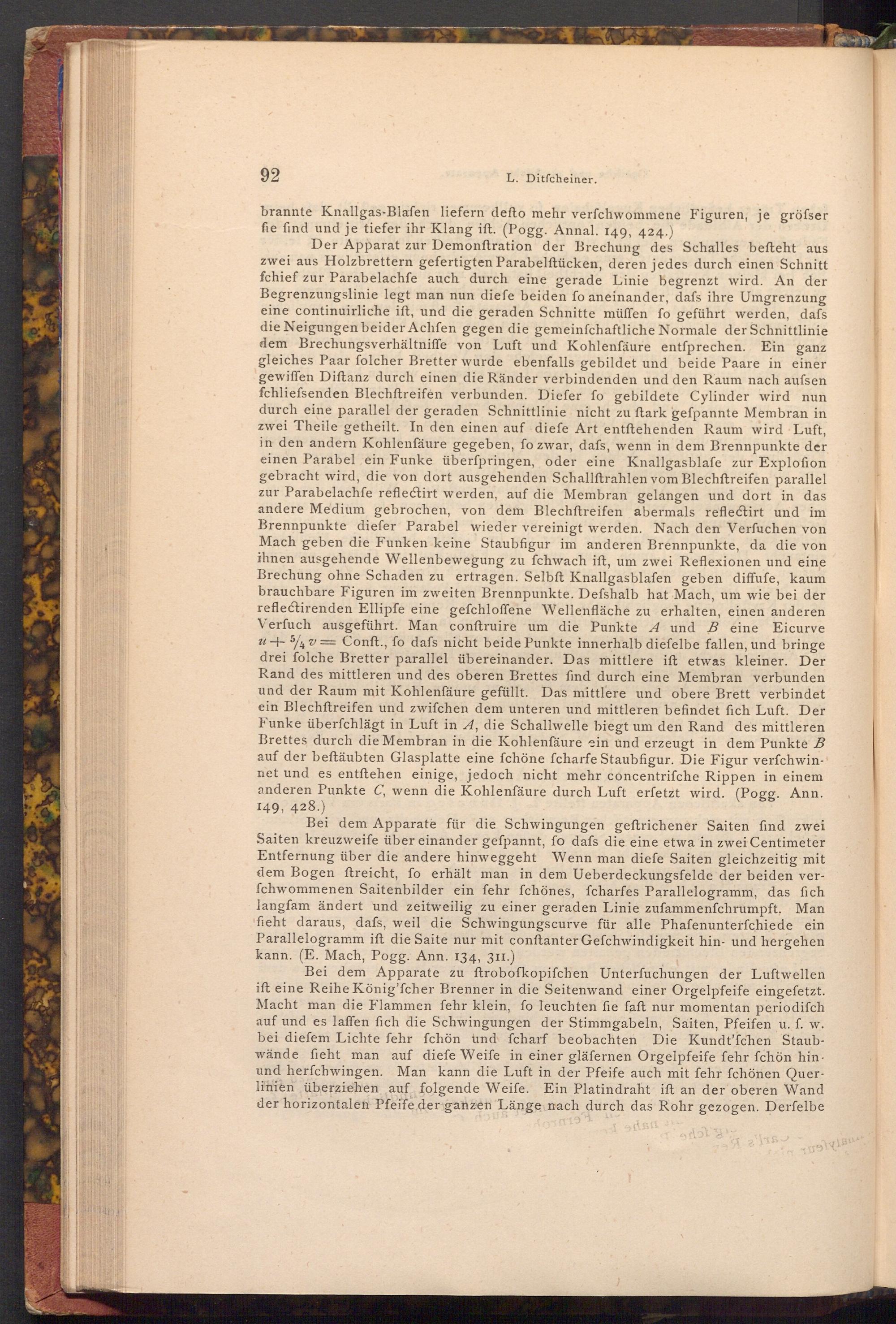 Der Apparat zur Demonftration der Brechung des Schalles beſteht aus zwei aus Holzbrettern gefertigten Parabelftücken, deren jedes durch einen Schnitt fchief zur Parabelachfe auch durch eine gerade Linie begrenzt wird. An der Begrenzungslinie legt man nun diefe beiden fo aneinander, dafs ihre Umgrenzung eine continuirliche ift, und die geraden Schnitte müffen fo geführt werden, dafs die Neigungen beider Achfen gegen die gemeinfchaftliche Normale der Schnittlinie dem Brechungsverhältniffe von Luft und Kohlenfäure entſprechen. Ein ganz gleiches Paar folcher Bretter wurde ebenfalls gebildet und beide Paare in einer gewiffen Diftanz durch einen die Ränder verbindenden und den Raum nach aufsen fchliefsenden Blechftreifen verbunden. Diefer fo gebildete Cylinder wird nun durch eine parallel der geraden Schnittlinie nicht zu ftark gefpannte Membran in zwei Theile getheilt. In den einen auf diefe Art entſtehenden Raum wird Luft, in den andern Kohlenfäure gegeben, fo zwar, dafs, wenn in dem Brennpunkte der einen Parabel ein Funke überfpringen, oder eine Knallgasblafe zur Exploſion gebracht wird, die von dort ausgehenden Schallftrahlen vom Blechftreifen parallel zur Parabelachfe reflectirt werden, auf die Membran gelangen und dort in das andere Medium gebrochen, von dem Blechftreifen abermals reflectirt und im Brennpunkte diefer Parabel wieder vereinigt werden. Nach den Verfuchen von Mach geben die Funken keine Staubfigur im anderen Brennpunkte, da die von ihnen ausgehende Wellenbewegung zu fchwach ift, um zwei Reflexionen und eine Brechung ohne Schaden zu ertragen. Selbft Knallgasblafen geben diffuſe, kaum brauchbare Figuren im zweiten Brennpunkte. Defshalb hat Mach, um wie bei der reflectirenden Ellipfe eine gefchloffene Wellenfläche zu erhalten, einen anderen Verfuch ausgeführt. Man conftruire um die Punkte A und B eine Eicurve u5v Conft., fo dafs nicht beide Punkte innerhalb diefelbe fallen, und bringe drei folche Bretter parallel übereinander. Das mittlere ift etwas kleiner. Der Rand des mittleren und des oberen Brettes find durch eine Membran verbunden und der Raum mit Kohlenfäure gefüllt. Das mittlere und obere Brett verbindet ein Blechftreifen und zwifchen dem unteren und mittleren befindet fich Luft. Der Funke überfchlägt in Luft in A, die Schallwelle biegt um den Rand des mittleren Brettes durch die Membran in die Kohlenfäure ein und erzeugt in dem Punkte B auf der beftäubten Glasplatte eine ſchöne fcharfe Staubfigur. Die Figur verfchwinnet und es entſtehen einige, jedoch nicht mehr concentrifche Rippen in einem anderen Punkte C, wenn die Kohlenfäure durch Luft erfetzt wird.( Pogg. Ann. 149, 428.)
