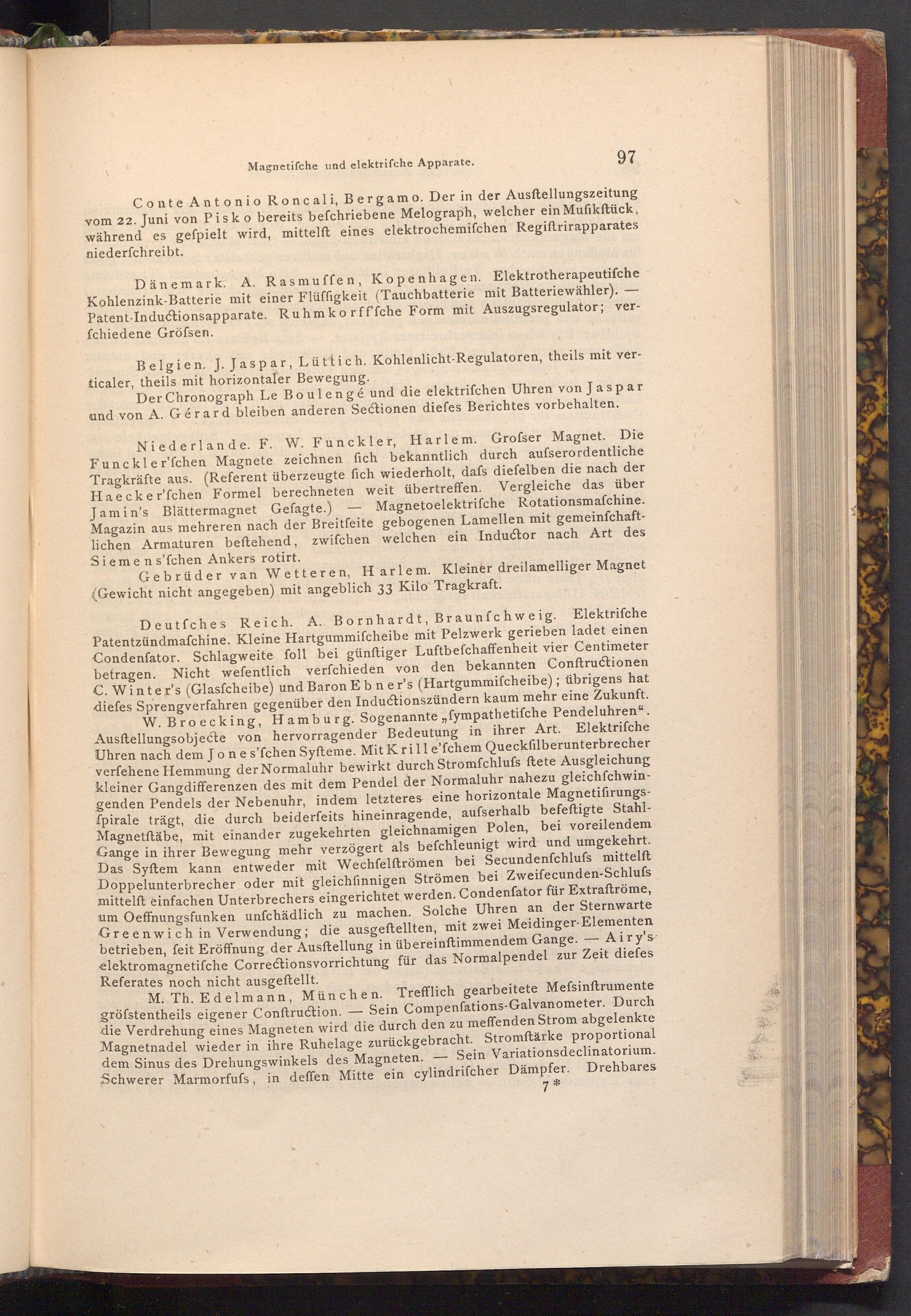 M. Th. Edelmann, München. Trefflich gearbeitete Mefsinftrumente gröfstentheils eigener Conftruction. Sein Compenfations- Galvanometer. Durch die Verdrehung eines Magneten wird die durch den zu meffenden Strom abgelenkte Magnetnadel wieder in ihre Ruhelage zurückgebracht. Stromftärke proportional dem Sinus des Drehungswinkels des Magneten. Sein Variationsdeclinatorium. Schwerer Marmorfufs, in deffen Mitte ein cylindrifcher Dämpfer. Drehbares