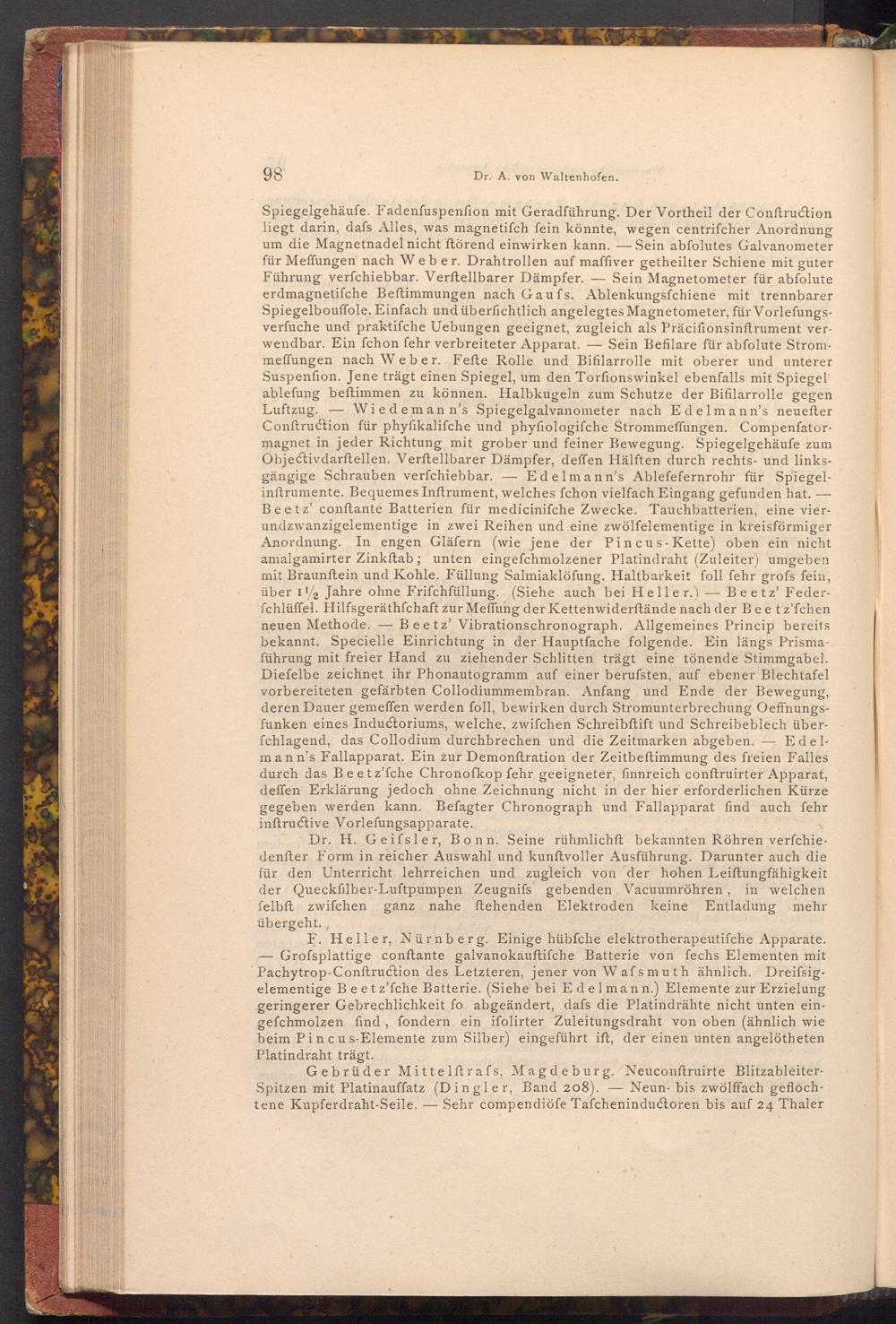 Spiegelgehäufe. Fadenfuspenfion mit Geradführung. Der Vortheil der Conftruction. liegt darin, dafs Alles, was magnetiſch fein könnte, wegen centrifcher Anordnung um die Magnetnadel nicht ftörend einwirken kann. Sein abfolutes Galvanometer für Meffungen nach Weber. Drahtrollen auf maffiver getheilter Schiene mit guter Führung verfchiebbar. Verftellbarer Dämpfer.-Sein Magnetometer für abfolute erdmagnetiſche Beftimmungen nach Gaufs. Ablenkungsfchiene mit trennbarer Spiegelbouffole. Einfach und überfichtlich angelegtes Magnetometer, für Vorlefungsverfuche und praktifche Uebungen geeignet, zugleich als Präcifionsinftrument verwendbar. Ein fchon fehr verbreiteter Apparat.- Sein Befilare für abfolute Strommeffungen nach Weber. Fefte Rolle und Bifilarrolle mit oberer und unterer Suspenfion. Jene trägt einen Spiegel, um den Torfionswinkel ebenfalls mit Spiegel ablefung beftimmen zu können. Halbkugeln zum Schutze der Bifilarrolle gegen Luftzug. Wiedemann's Spiegelgalvanometer nach Edelmann's neueſter Conftruction für phyſikaliſche und phyfiologifche Strommeffungen. Compenfatormagnet in jeder Richtung mit grober und feiner Bewegung. Spiegelgehäufe zum Objectivdarftellen. Verftellbarer Dämpfer, deffen Hälften durch rechts- und linksgängige Schrauben verfchiebbar.- Edelmann's Ablefefernrohr für Spiegelinftrumente. Bequemes Inftrument, welches fchon vielfach Eingang gefunden hat.- Beetz' conftante Batterien für medicinifche Zwecke. Tauchbatterien, eine vierundzwanzigelementige in zwei Reihen und eine zwölfelementige in kreisförmiger Anordnung. In engen Gläfern( wie jene der Pincus- Kette) oben ein nicht amalgamirter Zinkftab; unten eingefchmolzener Platindraht( Zuleiter) umgeben mit Braunftein und Kohle. Füllung Salmiaklöfung. Haltbarkeit foll fehr grofs fein, über 12 Jahre ohne Frifchfüllung.( Siehe auch bei Heller.)- Beetz' Federfchlüffel. Hilfsgeräthfchaft zur Meffung der Kettenwiderftände nach der Beetz'fchen neuen Methode. Beetz' Vibrations chronograph. Allgemeines Princip bereits bekannt. Specielle Einrichtung in der Hauptfache folgende. Ein längs Prismaführung mit freier Hand zu ziehender Schlitten trägt eine tönende Stimmgabel. Diefelbe zeichnet ihr Phonautogramm auf einer berufsten, auf ebener Blechtafel vorbereiteten gefärbten Collodiummembran. Anfang und Ende der Bewegung, deren Dauer gemeffen werden foll, bewirken durch Stromunterbrechung Oeffnungsfunken eines Inductoriums, welche, zwifchen Schreibftift und Schreibeblech überfchlagend, das Collodium durchbrechen und die Zeitmarken abgeben. Edelmann's Fallapparat. Ein zur Demonftration der Zeitbeftimmung des freien Falles durch das Beetz'fche Chronofkop fehr geeigneter, finnreich conftruirter Apparat, deffen Erklärung jedoch ohne Zeichnung nicht in der hier erforderlichen Kürze gegeben werden kann. Befagter Chronograph und Fallapparat find auch fehr inftructive Vorlefungsapparate.