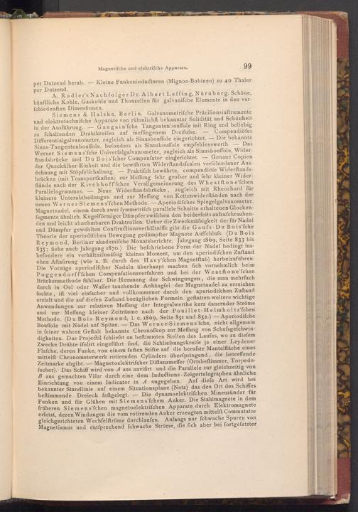 Siemens& Halske, Berlin. Galvanometrifche Präcifionsinftrumente und elektrotechnifche Apparate von rühmlichft bekannter Solidität und Schönheit in der Ausführung. Gaugain'fche Tangentenbouffole mit Ring und beliebig zu fchaltenden Drahtkreifen auf meffingenem Dreifusse. Differentialgalvanometer, zugleich als Sinusbouffole eingerichtet. Sinus- Tangentenbouffole, befonders als Sinusbouffole empfehlenswerth. Werner Siemens'fche Univerfalgalvanometer, zugleich als Sinusbouffole, Wider- Genaue Copien ftandsbrücke und Du Bois'fcher Compenfator eingerichtet. der Queckfilber- Einheit und die bewährten Widerftandsfcalen verfchiedener Ausdehnung mit Stöpfelfchaltung.- Praktiſch bewährte, compendiöfe Widerftandsbrücken( mit Transportkaften) zur Meffung fehr grofser und fehr kleiner Widerftände nach der Kirchhoff'fchen Verallgemeinerung des Wheatfton e'fchen Parallelogrammes. Neue Widerftandsbrücke, zugleich mit Rheochord für kleinere Unterabtheilungen und zur Meffung von Kettenwiderftänden nach der neuen Werner Siemens'fchen Methode.- Aperiodifches Spiegelgalvanometer. Magnetnadel, einem durch zwei fymmetriſch parallele Schnitte erhaltenen Glockenfegmente ähnlich. Kugelförmiger Dämpfer zwifchen den beiderfeits aufzufchraubenden und leicht abnehmbaren Drahtrollen. Ueber die Zweckmäfsigkeit der für Nadel und Dämpfer gewählten Conftructionsverhältniffe gibt die Gaufs- Du Bois'fche Theorie der aperiodifchen Bewegung gedämpfter Magnete Auffchlufs.( Du Bois Reymond, Berliner akademifche Monatsberichte, Jahrgang 1869, Seite 833 bis 835; fiehe auch Jahrgang 1870.) Die befchriebene Form der Nadel bedingt insbefondere ein verhältnifsmäfsig kleines Moment, um den aperiodifchen Zuſtand ohne Aftafirung( wie z. B. durch den Hauy'fchen Magnetftab) herbeizuführen. Die Vorzüge aperiodifcher Nadeln überhaupt machen fich vornehmlich beim Poggendorff'fchen Compenfationsverfahren und bei der Weatftone'fchen Brückenmethode fühlbar. Die Hemmung der Schwingungen, die man mehrfach durch in Oel oder Waffer tauchende Anhängfel der Magnetnadel zu erreichen fuchte, ift viel einfacher und vollkommener durch den aperiodifchen Zuftand erzielt und die auf diefen Zuftand bezüglichen Formeln geftatten weitere wichtige Anwendungen zur relativen Meffung der Integralwerthe kurz dauernder Ströme