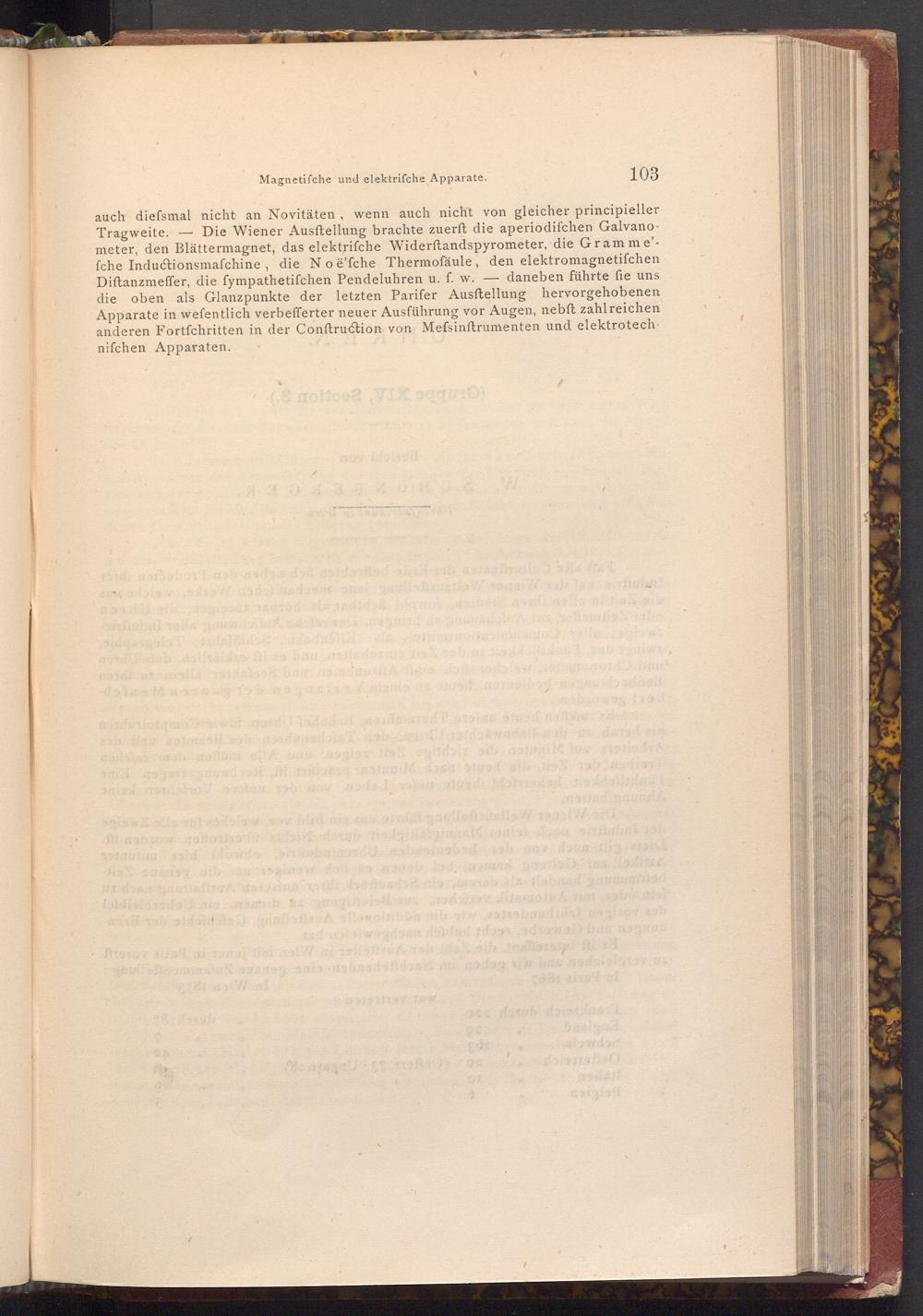 auch diefsmal nicht an Novitäten, wenn auch nicht von gleicher principieller Tragweite. Die Wiener Ausftellung brachte zuerft die aperiodifchen Galvanometer, den Blättermagnet, das elektrifche Widerftandspyrometer, die Gramme'fche Inductionsmaschine, die Noë'fche Thermofäule, den elektromagnetiſchen Diftanzmeffer, die fympathetifchen Pendeluhren u. f. w. daneben führte fie uns die oben als Glanzpunkte der letzten Parifer Ausftellung hervorgehobenen Apparate in wefentlich verbefferter neuer Ausführung vor Augen, nebft zahlreichen anderen Fortfchritten in der Conftruction von Mefsinftrumenten und elektrotechnifchen Apparaten.