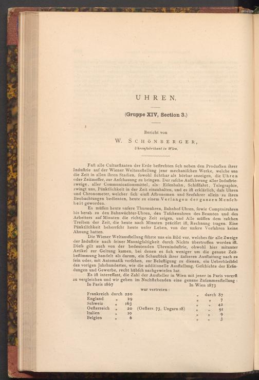 Faft alle Culturftaaten der Erde beftrebten fich neben den Producten ihrer Induſtrie auf der Wiener Weltausftellung jene mechanifchen Werke, welche uns die Zeit in allen ihren Stadien, fowohl fichtbar als hörbar anzeigen, die Uhren oder Zeitmeffer, zur Anfchauung zu bringen. Der rafche Auffchwung aller Induſtriezweige, aller Communicationsmittel, als: Eifenbahn, Schifffahrt, Telegraphie, zwingt uns, Pünktlichkeit in der Zeit einzuhalten, und es ift erklärlich, dafs Uhren und Chronometer, welcher fich einft Aftronomen und Seefahrer allein zu ihren Beobachtungen bedienten, heute zu einem Verlangen der ganzen Menfchheit geworden.