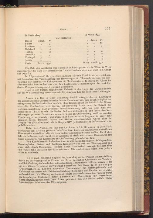 England. Während England im Jahre 1867 auf der Parifer Weltausstellung durch 29 der vorzüglichften Firmen mit ihren herrlichen Chronometer-, Tafchenund Schiffsuhren, fowie mit den unübertroffenen Thurmuhren brillirte, waren leider bei der Wiener Expofition nur 7 Firmen bemerkbar Die Firma: Klaftenberger ( Oefterreicher) in London exponirte Chronometer für Marinegebrauch und Tafchenchronometer mit Halbfecundenfchlag; Schnecke und Duplex waren dabei vorherrfchend. Kullberg aus London zeigte Marine chronometer, welche durch die beigelegten Certificate einer conftanten Abweichung mit veränderter Compenfationsunruhe nach Dent fchon gefunden hat. Mit Recht erhielt diefer fchöpferifche Fabrikant das Ehrendiplom.