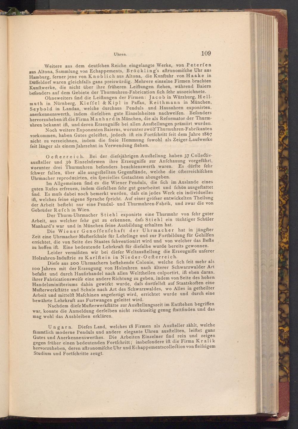 O efterreich. Bei der diefsjährigen Ausftellung haben 37 Collectivausfteller und 36 Einzelnfirmen ihre Erzeugniffe zur Anfchauung vorgeführt, worunter drei Thurmuhren befonders beachtenswerth waren. Es dürfte fehr fchwer fallen, über alle ausgeftellten Gegenftände, welche die öfterreichischen Uhrmacher reproducirten, ein fpecielles Gutachten abzugeben.