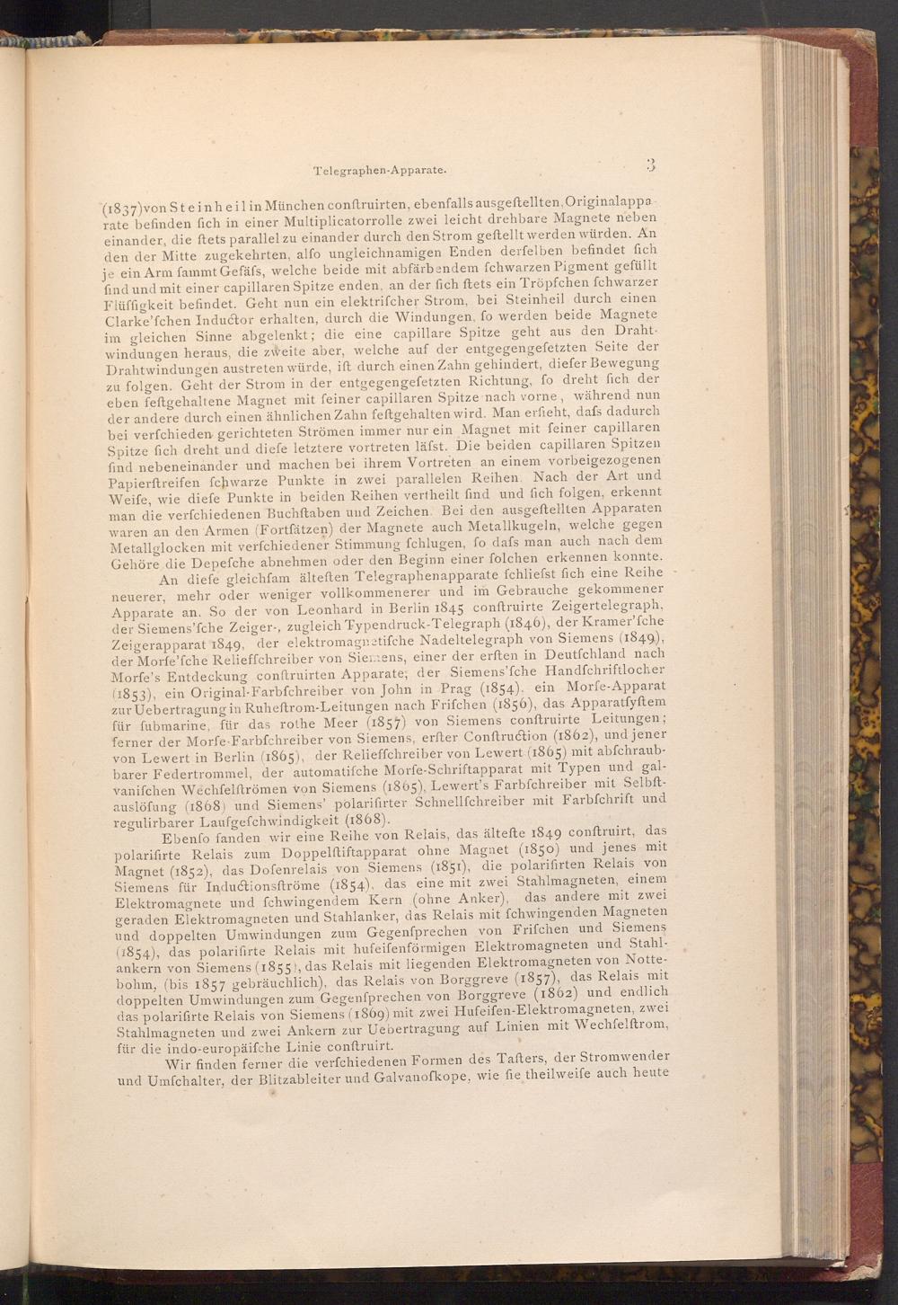 ( 1837) von Steinheil in München conftruirten, ebenfalls ausgeftellten, Originalappa. rate befinden fich in einer Multiplicatorrolle zwei leicht drehbare Magnete neben einander, die ftets parallel zu einander durch den Strom geftellt werden würden. An den der Mitte zugekehrten, alfo ungleichnamigen Enden derfelben befindet fich je ein Arm fammt Gefäfs, welche beide mit abfärbendem fchwarzen Pigment gefüllt find und mit einer capillaren Spitze enden, an der fich ftets ein Tröpfchen fchwarzer Flüffigkeit befindet. Geht nun ein elektriſcher Strom, bei Steinheil durch einen Clarke'fchen Inductor erhalten, durch die Windungen, fo werden beide Magnete im gleichen Sinne abgelenkt; die eine capillare Spitze geht aus den Drahtwindungen heraus, die zweite aber, welche auf der entgegengefetzten Seite der Drahtwindungen austreten würde, ift durch einen Zahn gehindert, diefer Bewegung zu folgen. Geht der Strom in der entgegengefetzten Richtung, fo dreht fich der eben feftgehaltene Magnet mit feiner capillaren Spitze nach vorne, während nun der andere durch einen ähnlichen Zahn feftgehalten wird. Man erfieht, dafs dadurch bei verfchieden gerichteten Strömen immer nur ein Magnet mit feiner capillaren Spitze fich dreht und diefe letztere vortreten läfst. Die beiden capillaren Spitzen find nebeneinander und machen bei ihrem Vortreten an einem vorbeigezogenen Papierftreifen fchwarze Punkte in zwei parallelen Reihen. Nach der Art und Weife, wie diefe Punkte in beiden Reihen vertheilt find und fich folgen, erkennt man die verfchiedenen Buchftaben und Zeichen. Bei den ausgeftellten Apparaten waren an den Armen( Fortfätzen) der Magnete auch Metallkugeln, welche gegen Metallglocken mit verfchiedener Stimmung fchlugen, fo dafs man auch nach dem Gehöre die Depefche abnehmen oder den Beginn einer folchen erkennen konnte. An diefe gleichfam älteften Telegraphenapparate fchliefst fich eine Reihe neuerer, mehr oder weniger vollkommenerer und im Gebrauche gekommener Apparate an. So der von Leonhard in Berlin 1845 conftruirte Zeigertelegraph, der Siemens'fche Zeiger-, zugleich Typendruck- Telegraph( 1846), der Kramer'fche Zeigerapparat 1849, der elektromagnetifche Nadeltelegraph von Siemens( 1849), der Morfe'fche Relieffchreiber von Siemens, einer der erften in Deutfchland nach Morfe's Entdeckung conftruirten Apparate, der Siemens'fche Handfchriftlocher ( 1853), ein Original- Farbfchreiber von John in Prag( 1854). ein Morfe- Apparat zur Uebertragung in Ruheftrom- Leitungen nach Frifchen( 1856), das Apparatfyftem für fubmarine, für das rothe Meer( 1857) von Siemens conftruirte Leitungen; ferner der Morfe Farbfchreiber von Siemens, erfter Conftruction( 1862), und jener von Lewert in Berlin( 1865), der Relieffchreiber von Lewert( 1865) mit abfchraubbarer Federtrommel, der automatiſche Morfe- Schriftapparat mit Typen und galvanifchen Wechfelftrömen von Siemens( 1865), Lewert's Farbfchreiber mit Selbftauslöfung( 1868) und Siemens' polarifirter Schnellfchreiber mit Farbfchrift und regulirbarer Laufgefchwindigkeit( 1868).
