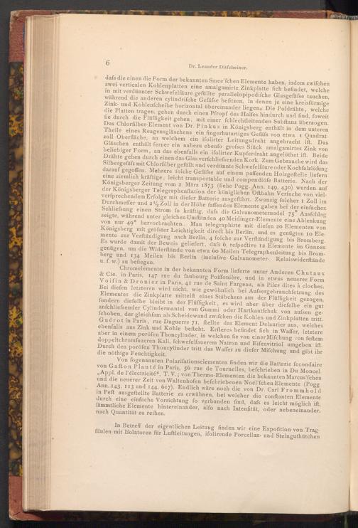 dafs die einen die Form der bekannten Smee'fchen Elemente haben, indem zwifchen zwei verticalen Kohlenplatten eine amalgamirte Zinkplatte fich befindet, welche in mit verdünnter Schwefelfäure gefüllte parallelopipe difche Glasgefäfse tauchen, während die anderen cylindrifche Gefäfse befitzen, in denen je eine kreisförmige Zink- und Kohlenfcheibe horizontal übereinander liegen. Die Poldrähte, welche die Platten tragen, gehen durch einen Pfropf des Halfes hindurch und find, foweit fie durch die Flüffigkeit gehen, mit einer fchlechtleitenden Subftanz überzogen. Das Chlorfilber- Element von Dr. Pinkus in Königsberg enthält in dem unteren Theile eines Reagensgläschens ein fingerhutartiges Gefäfs von etwa I Quadrat zoll Oberfläche, an welchem ein ifolirter Leitungsdraht angebracht ift. Das Gläschen enthält ferner ein nahezu ebenfo grofses Stück amalgamirtes Zink von beliebiger Form, an das ebenfalls ein ifolirter Kupferdraht angelöthet ift. Beide Drähte gehen durch einen das Glas verfchliefsenden Kork. Zum Gebrauche wird das Silbergefäfs mit Chlorfilber gefüllt und verdünnte Schwefelfäure oder Kochfalzlöfung darauf gegoffen. Mehrere folche Gefäfse auf einem paffenden Holzgeftelle liefern eine ziemlich kräftige, leicht transportable und compendiöfe Batterie. Nach der Königsberger Zeitung vom 2. März 1873( fiehe Pogg. Ann. 149, 430) wurden auf der Königsberger Telegraphenftation der königlichen Oftbahn Verfuche von vielverfprechendem Erfolge mit diefer Batterie ausgeführt. Zwanzig folcher I Zoll im Durchmeffer und 2½ Zoll in der Höhe faffenden Elemente gaben bei der einfacher. Schliefsung einen Strom fo kräftig, dafs die Galvanometernadel 75 Ausfchlag zeigte, während unter gleichen Umftänden 40 Meidinger- Elemente eine Ablenkung von nur 49° hervorbrachten.. Man telegraphirte mit diefen 20 Elementen von Königsberg mit gröfster Leichtigkeit direct bis Berlin, und es genügten 10 Ele. mente zur Verftändigung nach Berlin, 4 folche zur Verftändigung bis Bromberg. Es wurde damit der Beweis geliefert, dafs 6, refpective 12 Elemente im Ganzen genügen, um die Widerftände von etwa 60 Meilen Telegraphenleitung bis Bromberg und 134 Meilen bis Berlin( inclufive Galvanometer- Relaiswiderstände u. f. w.) zu befiegen.